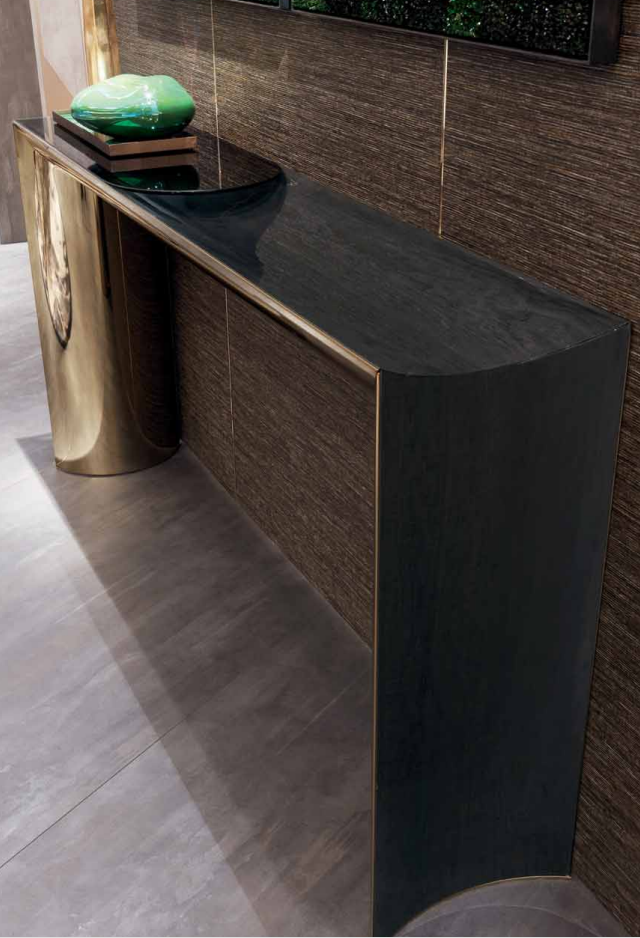 Console in wood with polished veneered concave legs and top, the inside part is covered in curved polished stainless steel. Second partial top in smoked crystal. Metal parts available in the metal fifinishing selection, wooden parts available in the veneer selection fifinishings. Console in solid marble with concave work for top and legs, handmade polished. The inside part is covered in curved polished stainless steel. Second partial top in smoked crystal. Metal parts available in the metal fifinishing selection, wooden parts available in the veneer selection fifinishings.