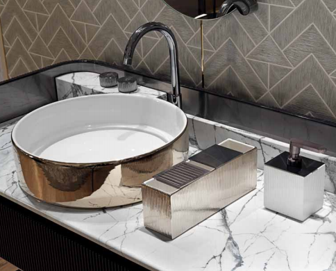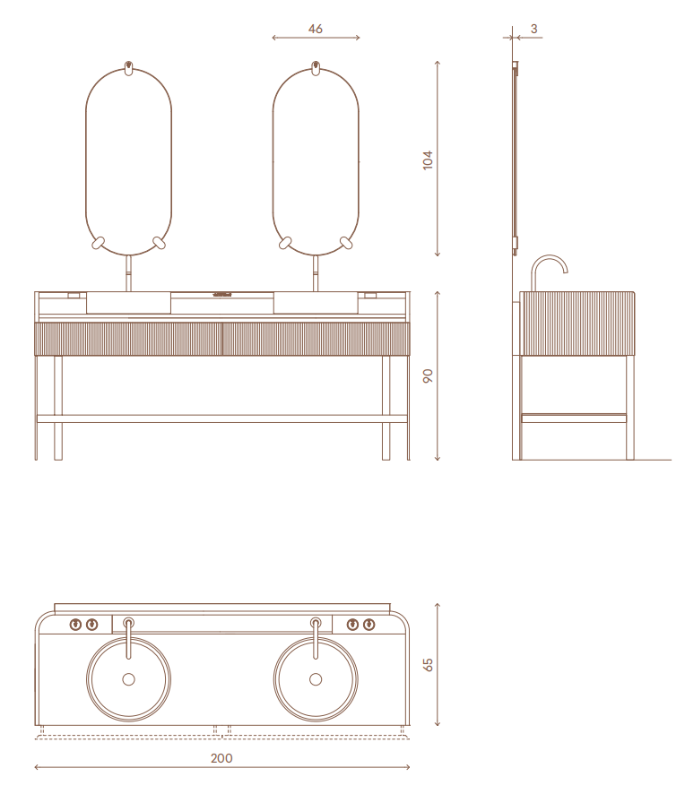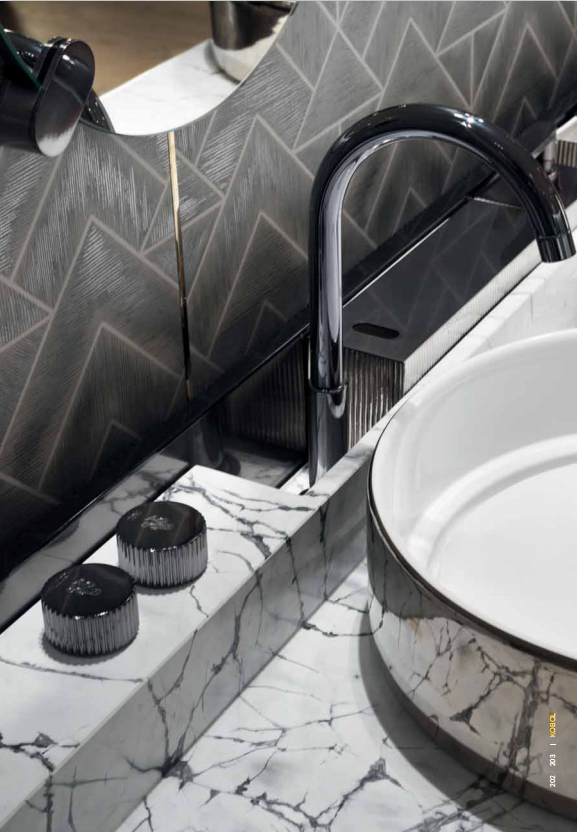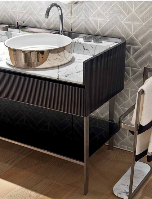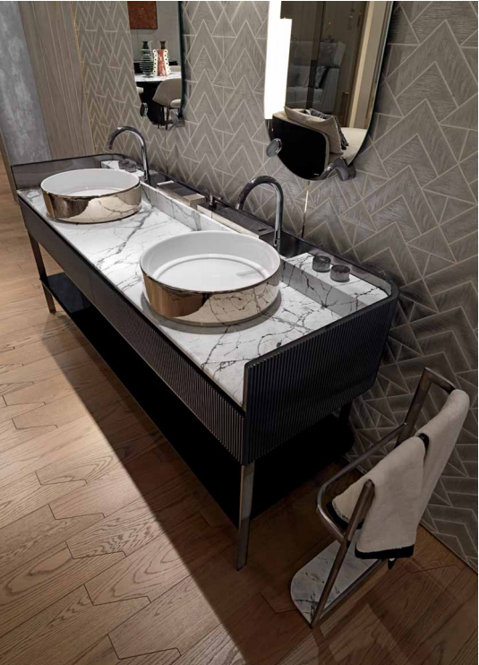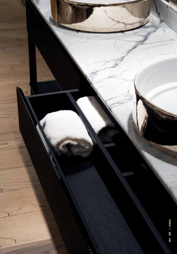 Console with two washbasins, wooden cabinet with two drawers with side and back in solid wood carved in bas-relief with "canneté" processing, internally covered in satin stainless steel. Boxed marble top with raised rear part to support the taps. The faucets and the knobs are made of solid chromed brass. Glazed ceramic washbasin with white, gold or platinum enamelled exterior, provided with ceramic drain plate. Structure in brushed stainless steel, equipped with glass or marble towel shelf. Prepared for wall mounting. Wooden parts are also available in polished lacquered fifinish. Metal parts available in the metal fifinishing selection. Compatible with Kobol bathroom accessories line.