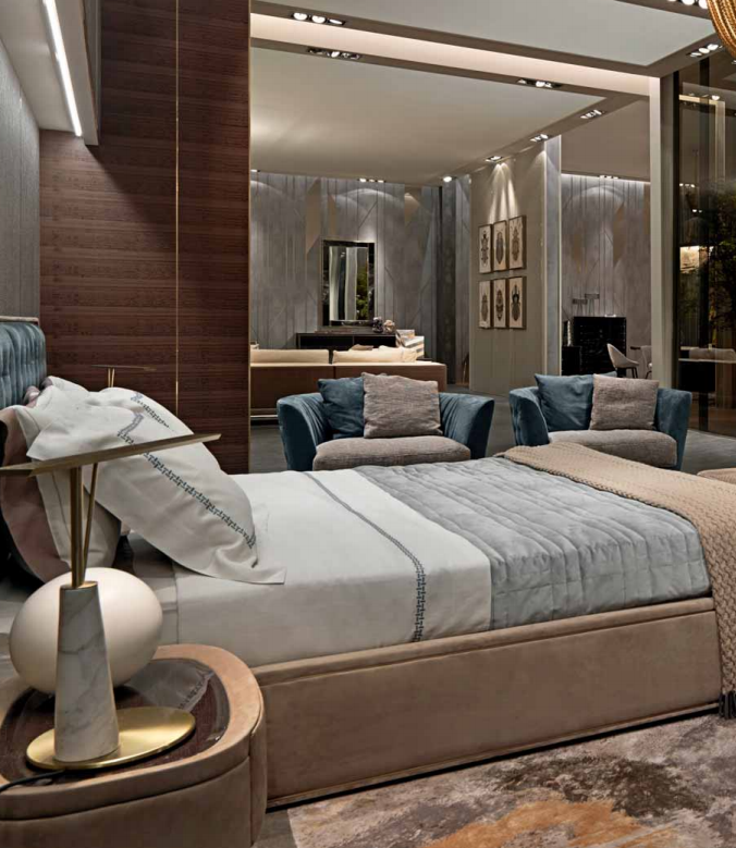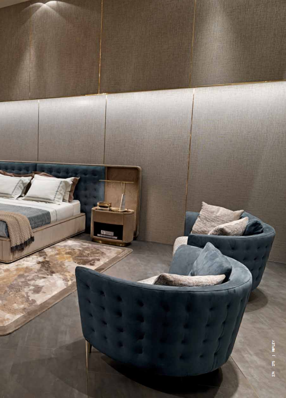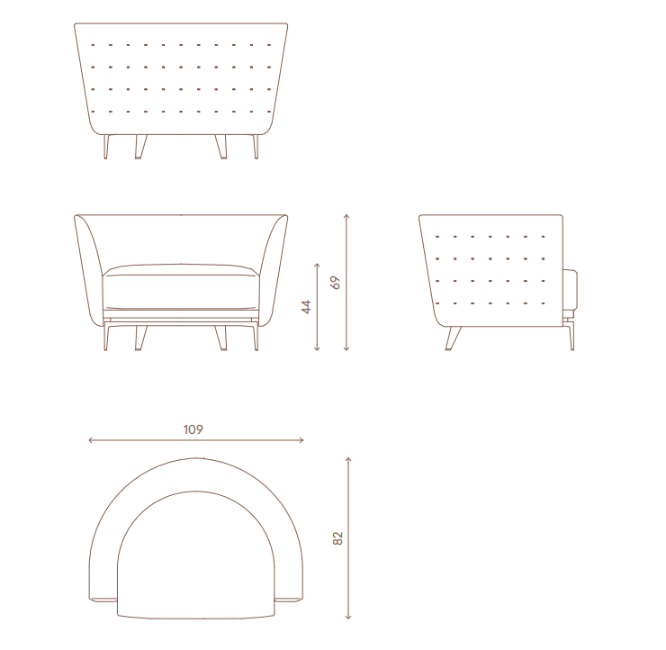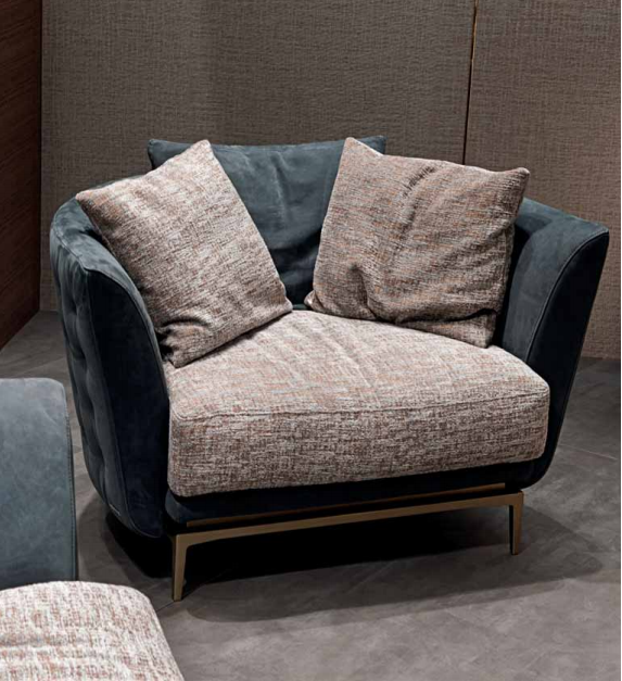 Structure in solid wood and plywood with elastic straps, padding in polyurethane with different densities. Upholstered in leather or fabric. Quilted backrest. Rear feet upholstered in leather or fabric. Base and front feet in satinized stainless steel available in the metal fifinishing selection.
