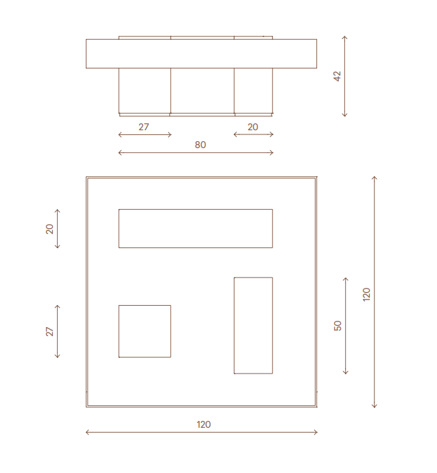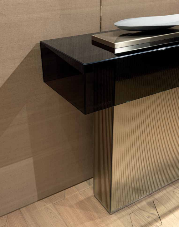 Coffee table composed of three bases covered in marble and satin stainless steel. Smoked crystal top th.8 mm boxed by UV bonding. Additional fifinishing tops in marble and stainless steel with alternating materials at the bases. The metal parts are available in the metal satinized fifinishing selection.