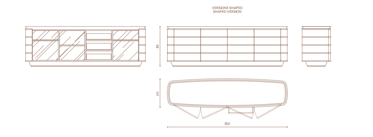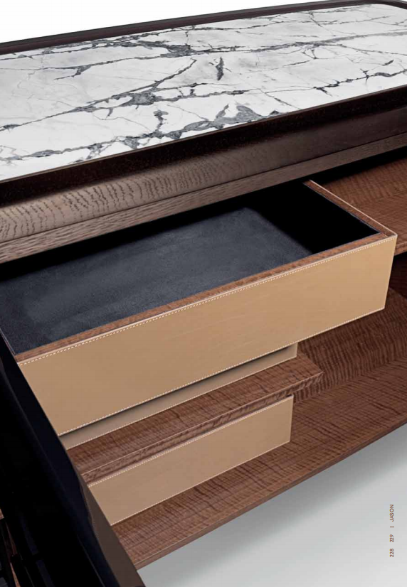 Cabinet with 4 doors, semi-elliptical central body in curved wood on all sides, external surface with raised profifiles, glossy lacquered fifinish. Marble top inserted in a molded frame in solid Oak wood with black open-pore fifinish. Conical base in black wood and lower profifile in satin metal. Interiors with shelves and drawers, fifinished in eucalyptus root with open pore fifinish and smoked mirror backs. Drawers covered in leather with microfifibre lining. Available with internal LED lighting. Also available in the "Wall" version with flat back