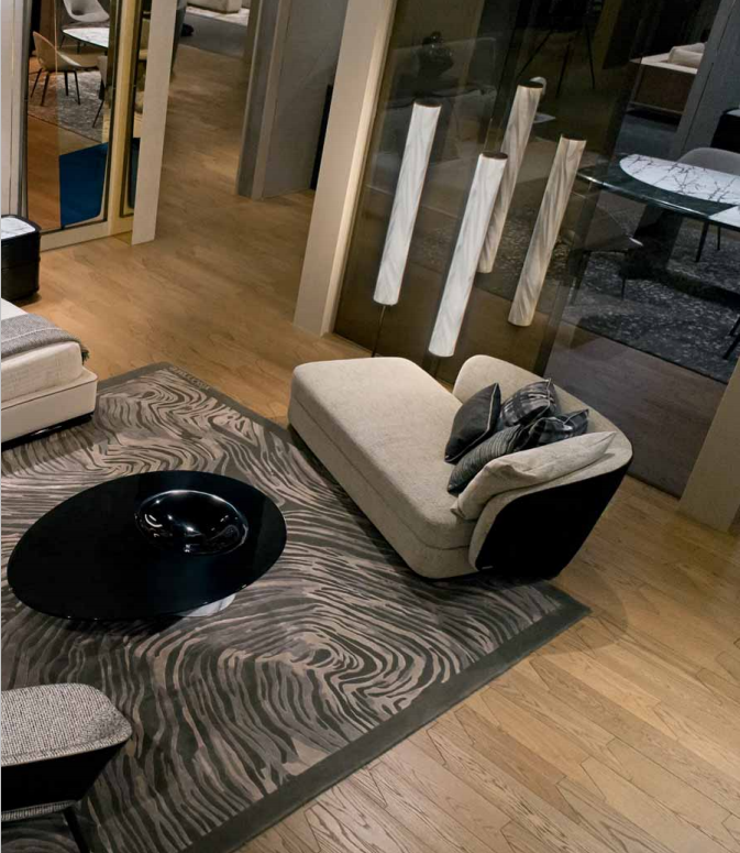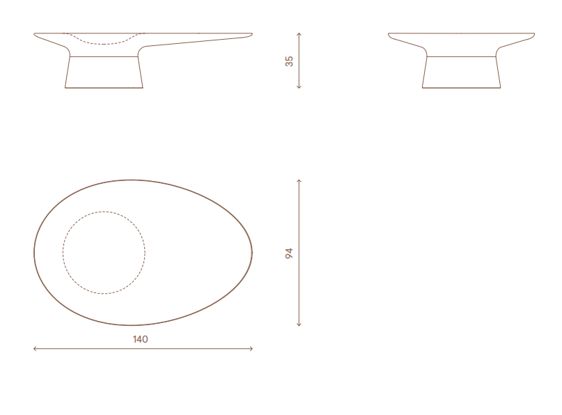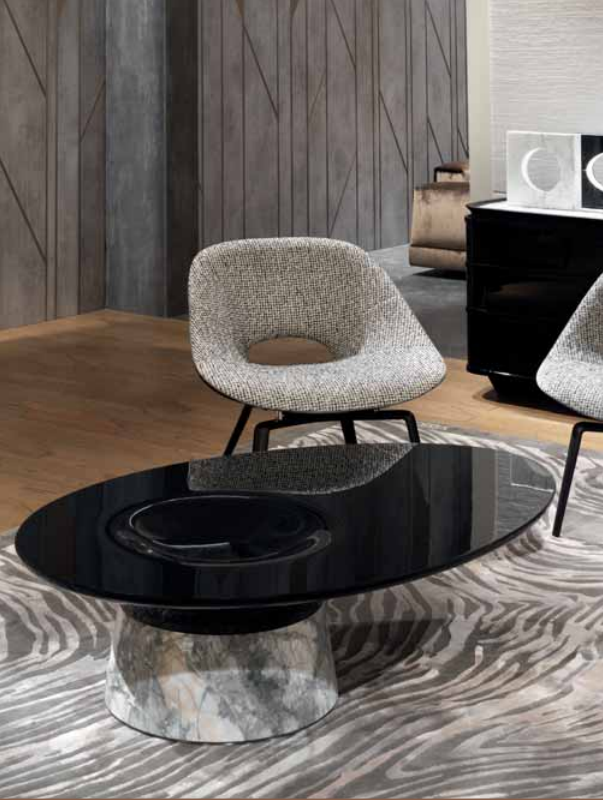 Oval low table with top in wood fifiber graven organic form with 100 gloss lacquered fifinish. Object compartment in the top. The lower part, of eccentric shape, flows into a conical base in solid marble, milled from a single block. Support base in brushed steel.