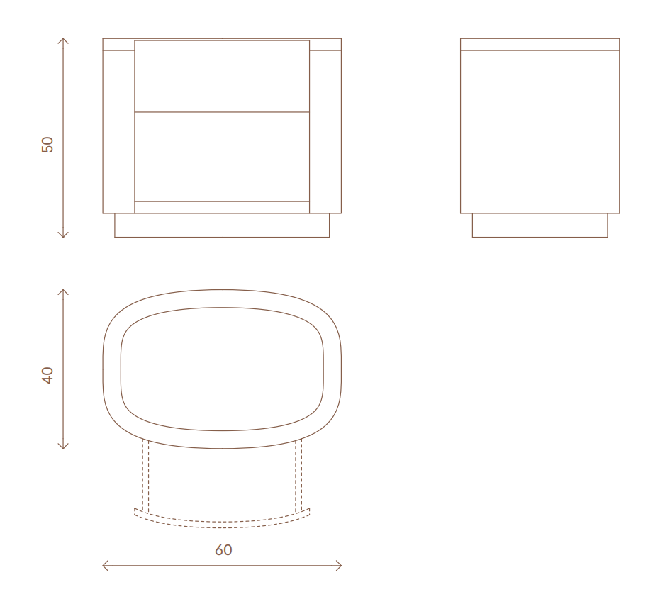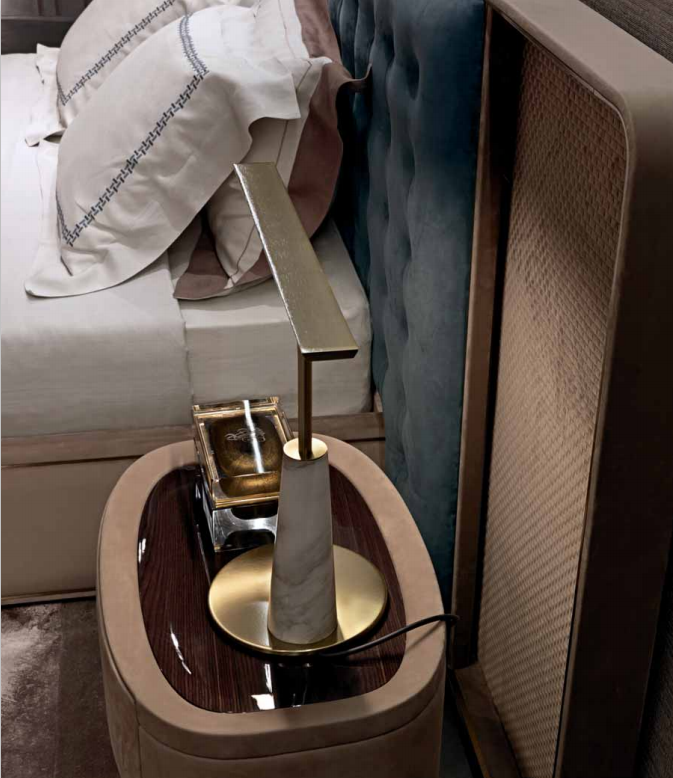 Bedside table upholstered in leather or fabric with drawer and open lower shelf, slightly padded curved structure in plywood, drawer with damped runners, internal part matt lacquered and upholstered front part. Top and lower shelf in bronze or smoke mirror. Curved base in MDF, coated in satinized stainless steel. Metal parts available lacquered in gold, champagne, bronze, Siena, black nickel and gunmetal fifinishing.