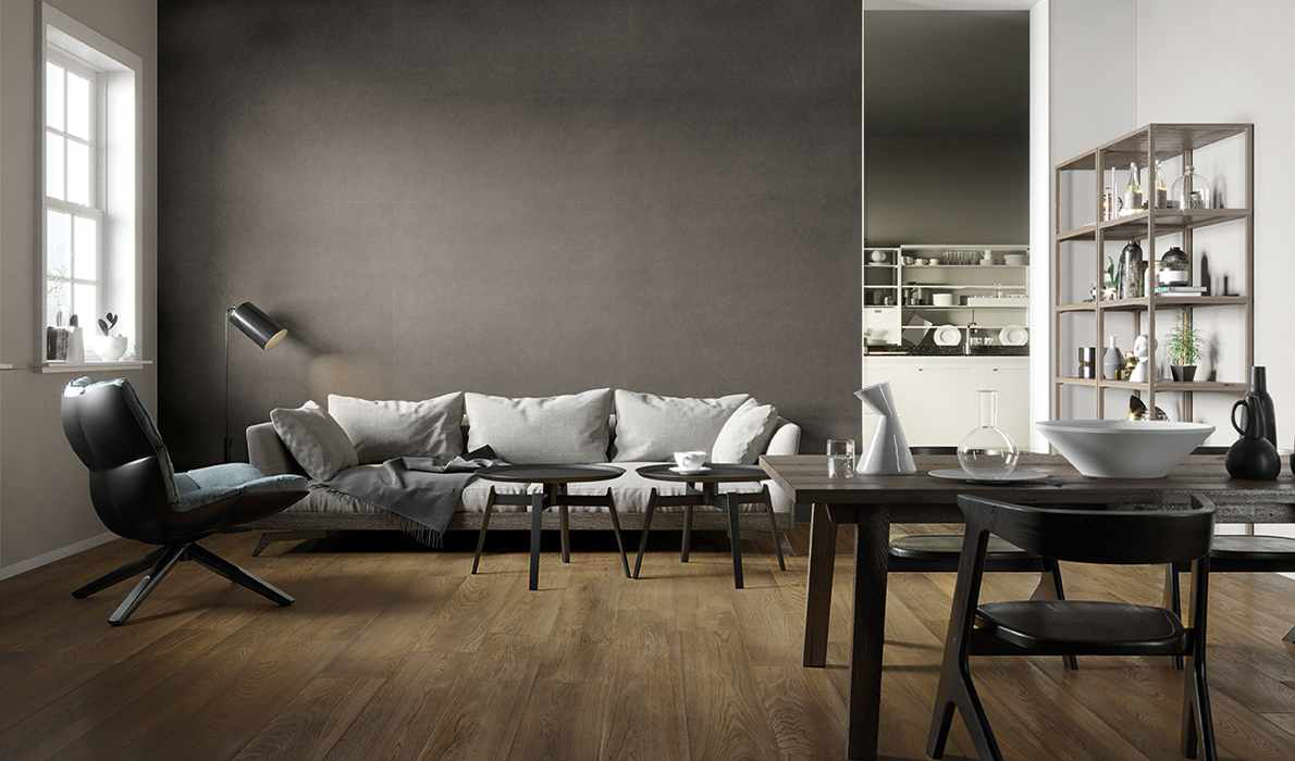No Code by Viva is the Emilgroup ceramic collection that combines three different materials: stone effect, wood effect and leather effect. Compact, soft slate, a varnished saw-cut wood, a substantial waxed wood and smooth, raised grain, crocodile-print leather skins are the co-stars of the collection.