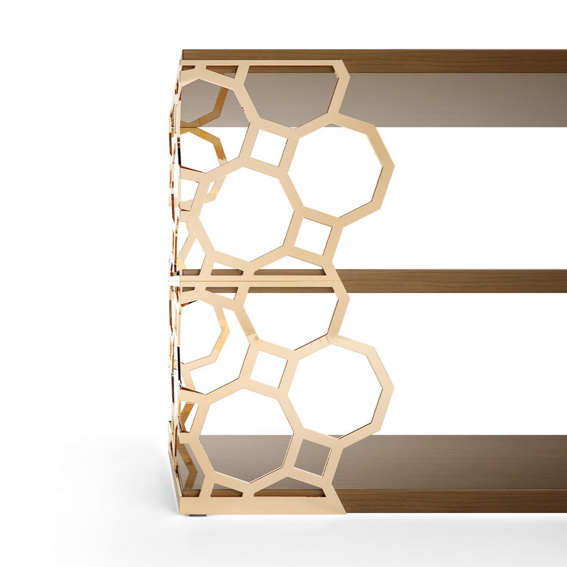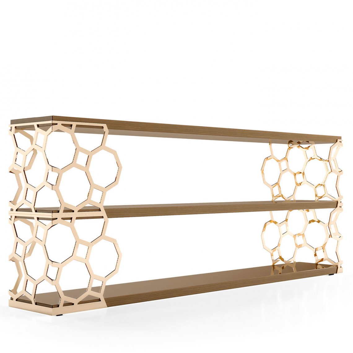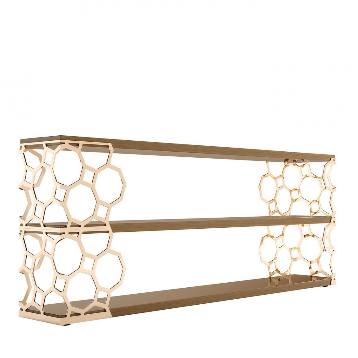 Sporting refined lines, this luxurious console exudes mid-century glamour that will work wonderfully in both modern and classic interiors accented with a statement lamp or decorative accent. The sides embracing the three Myrtle wood-veneered shelves are fashioned of laser-cut chrome-plated metal octagonal shapes connected by squares finished in shimmering gold. Part of the Jenny Collection, this console creates a commanding presence with its alluring lines.