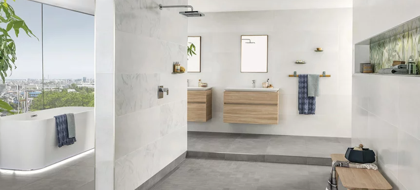 An urban concrete look in gentle natural tones, animated by inclusions reminiscent of hand-crafted terrazzo plus a sophisticated décor featuring lush, exotic plants and shimmering ceramics in calm shades of green – the high-quality URBAN JUNGLE design concept combines current design themes and interprets them in a new and distinct vein.