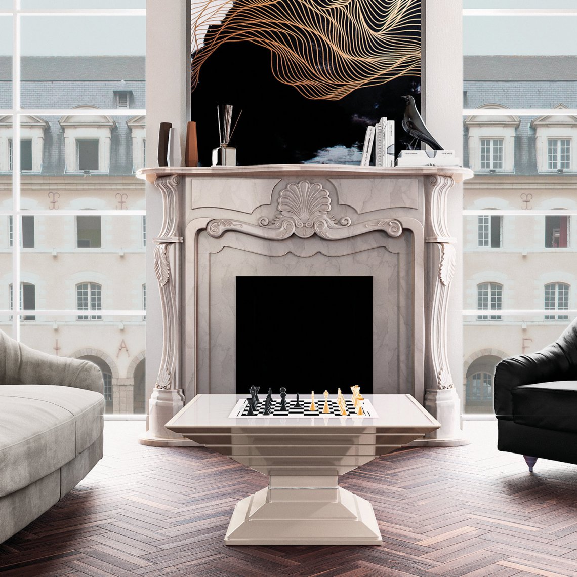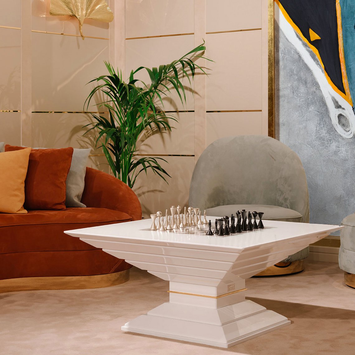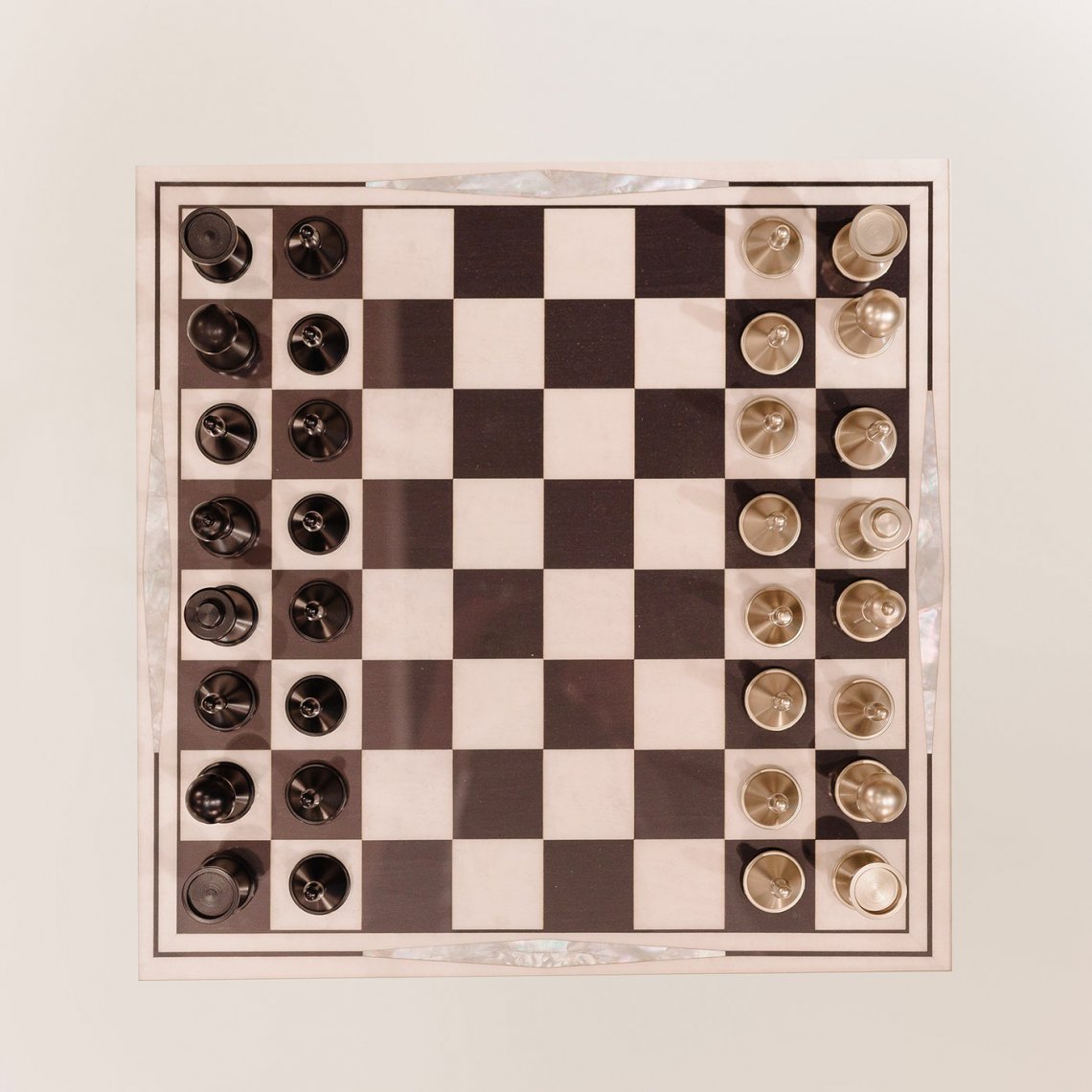 A multifunctional squared game and coffee table, with lift mechanism powered by lithium battery rechargeable from electrical outlet. Top made of built-in lacquered glossy lilac grey tempered glass with inlaid chessboard in Ebony, Erable wood and mother-of-pearl. Chess and checkers pieces included. Complete of wooden backgammon cup with 5 dices. Inside compartments with built-in space to store game set.
