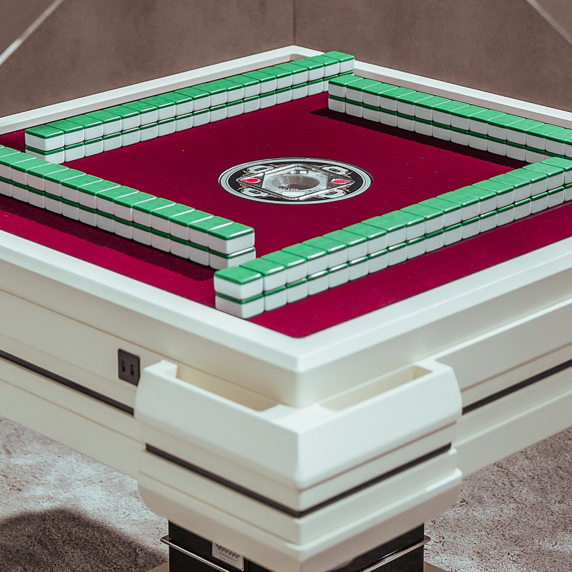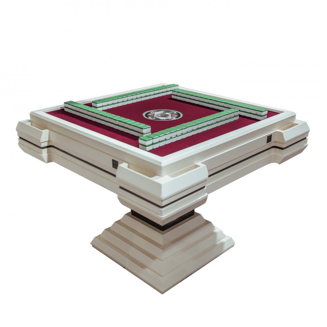Aesthetically, the combination of an original look and a modern style, is associated to traditional layout of the game red velvet surface, making this design piece a real artisan masterpiece. A table complete with functional pockets and USB ports, placed in player positions, with two professional Mahjong tiles sets. It has a lacquered matt ivory and dark brown structure with 24kt details