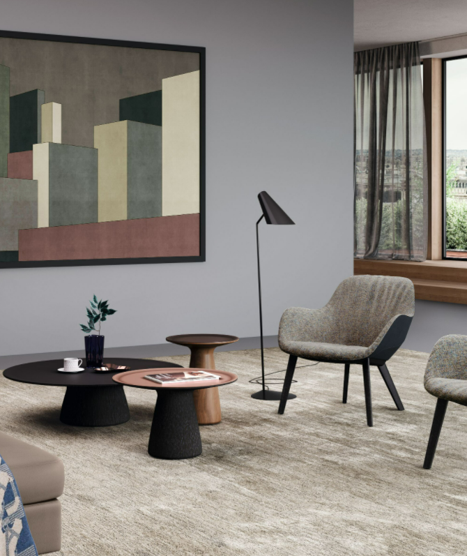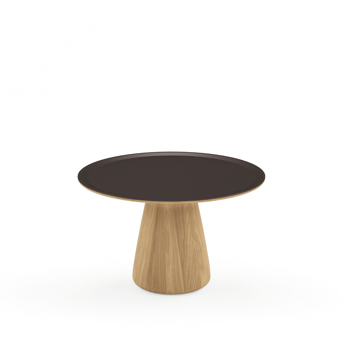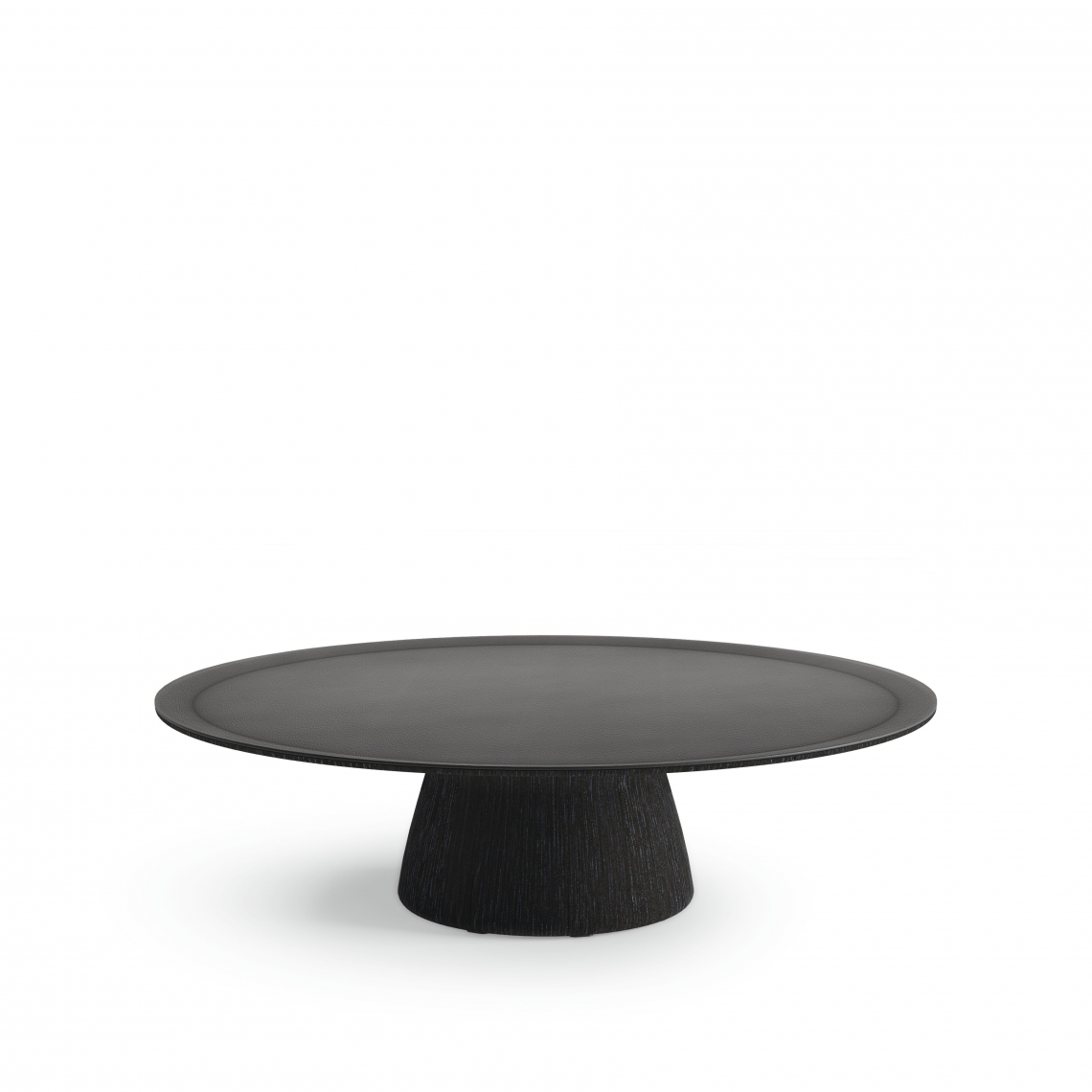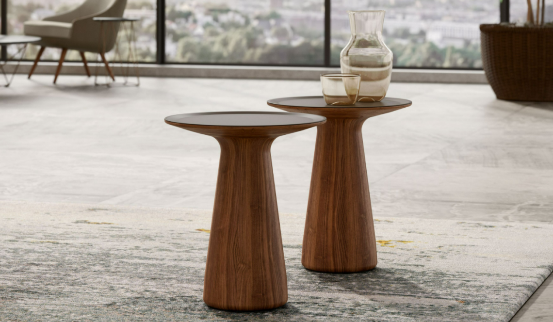 A small tree in the room – this occasional table appears to be rooted to the floor. Its richly grained solid walnut or oak stem tapers to support the streamlined table top with assured elegance. Available in black, bronze, or with an elegant leather covering.