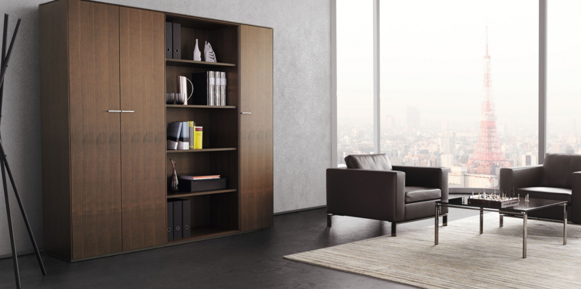 Clear design for timeless aesthetic. The Storage System is a modular storage solution for executive office, conference space, or home office. There are countless combination options: closed as a modular cupboard with doors and drawers, or open as a shelf.