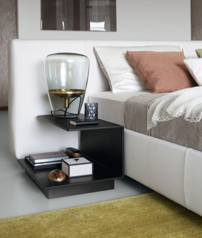 Nighttime storage for book and personal items near the bed. Functional and elegant, the swivel box guards personal treasures you like to keep hidden. This side table completes the comprehensive Yuuto sleep system comprising bed, banquette, and console.