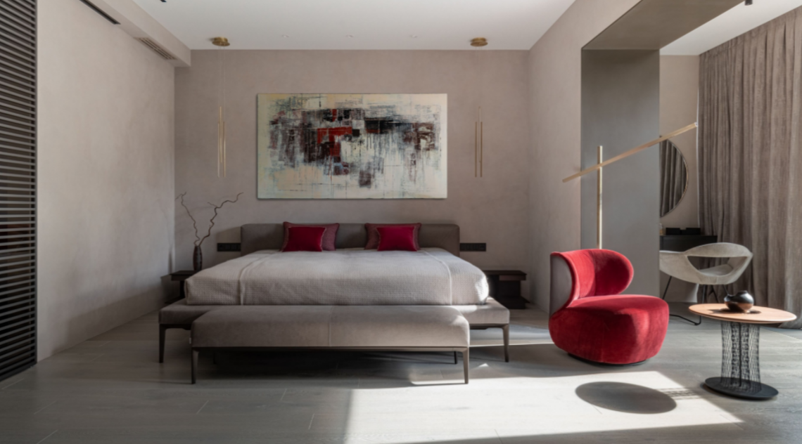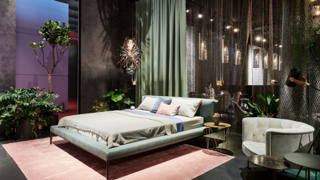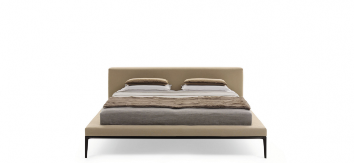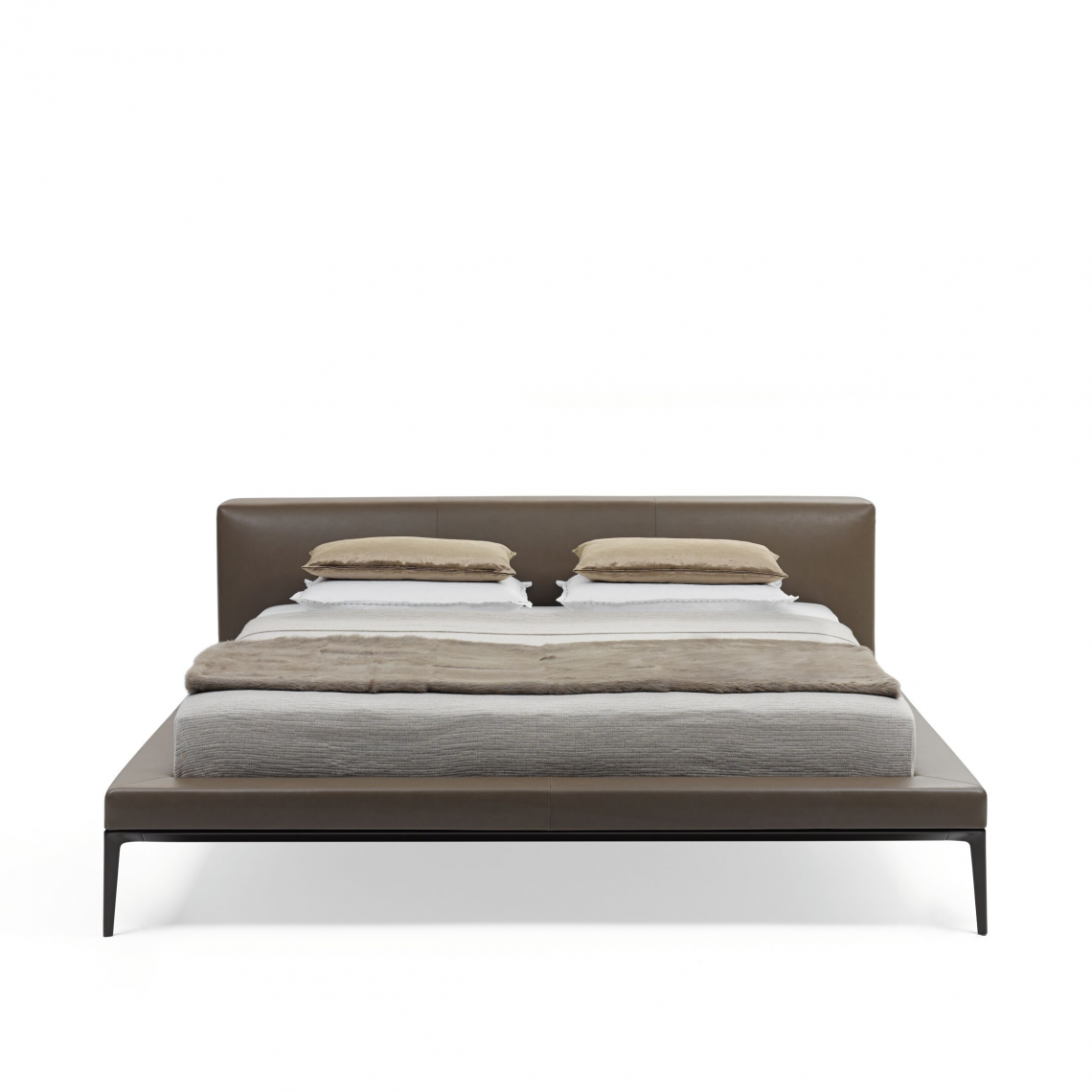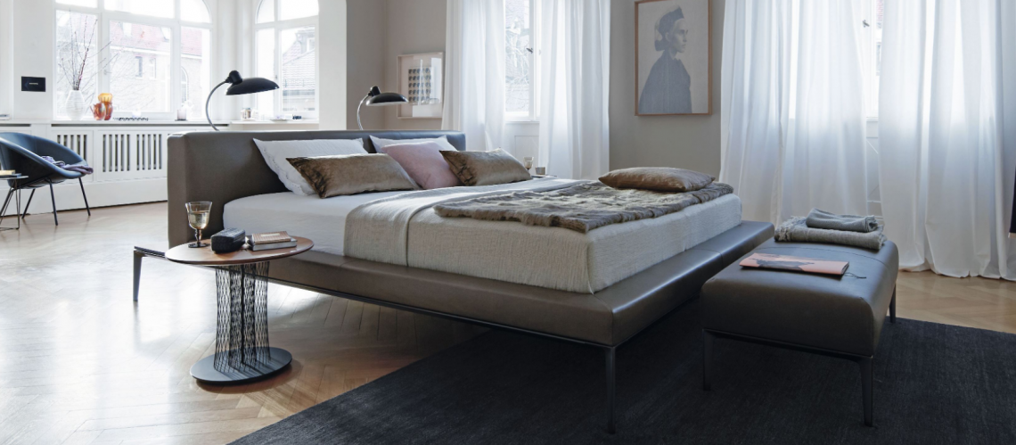 A generous bed area on a delicate frame – seemingly weightless, Jaan Bed shapes the room. The headboard and upholstered framework are in sleek leather or natural fabric. Ensuring added comfort are the matt gloss server and the shelf in black glass or striking saddle leather.