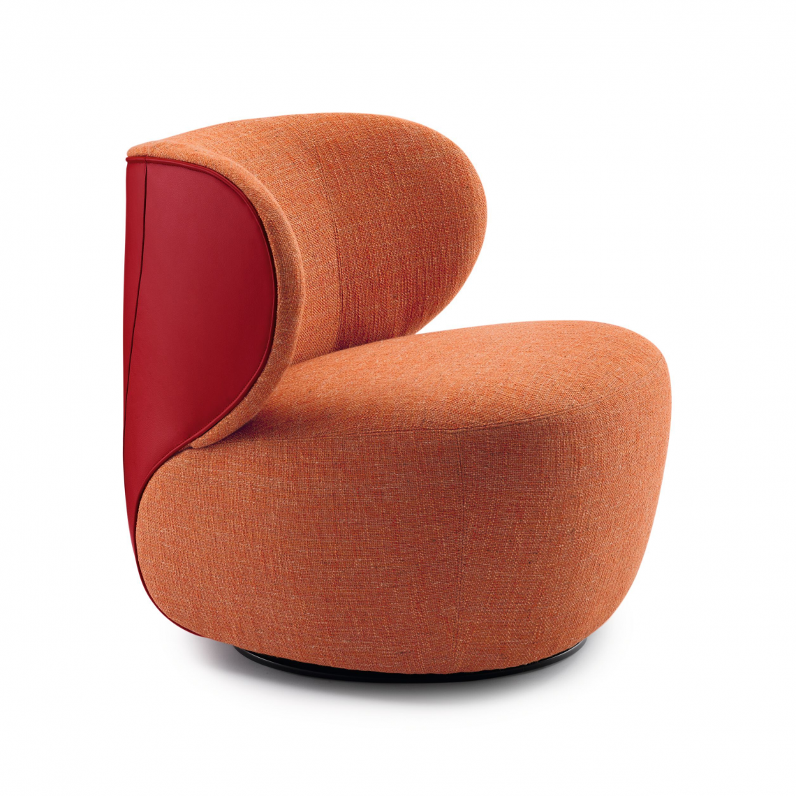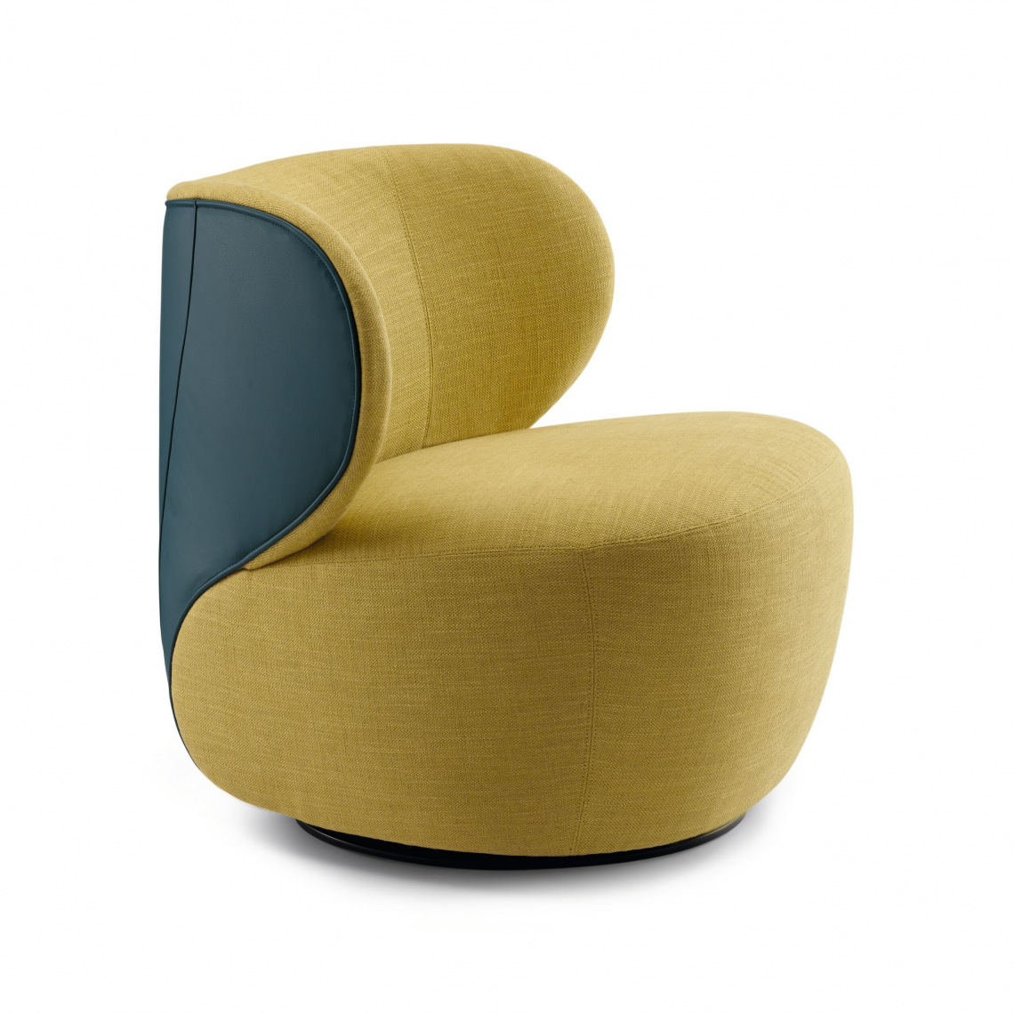Voluptuous, round curves provide Bao Armchair with its instinctive appeal. An opulent sculpture with an exquisite patchwork reverse like a leather ball. The swivel armchair comes in all combinations of fabric and leather, or upholstered exclusively in either fabric or leather.