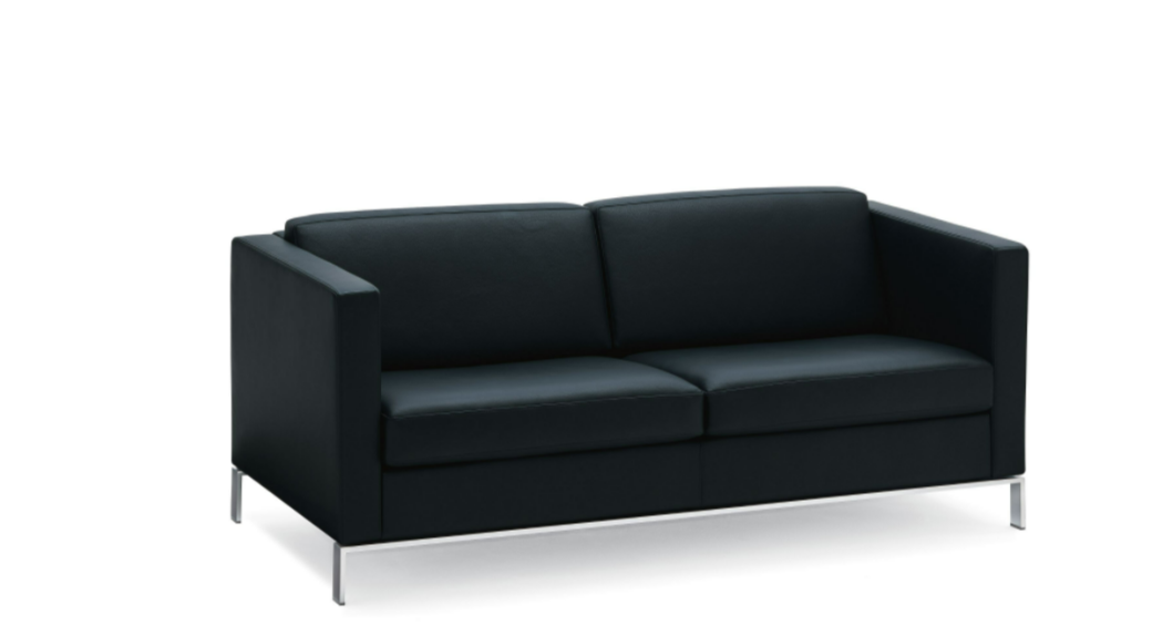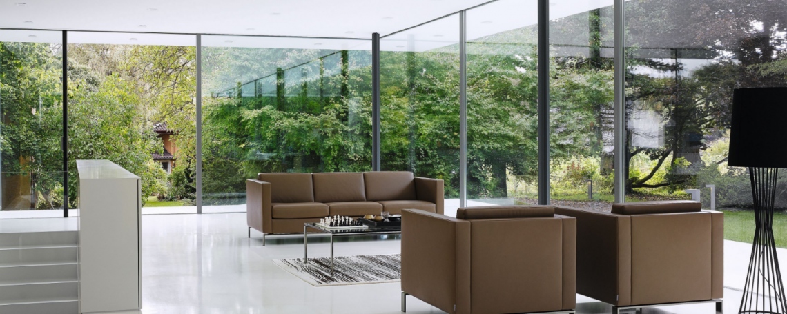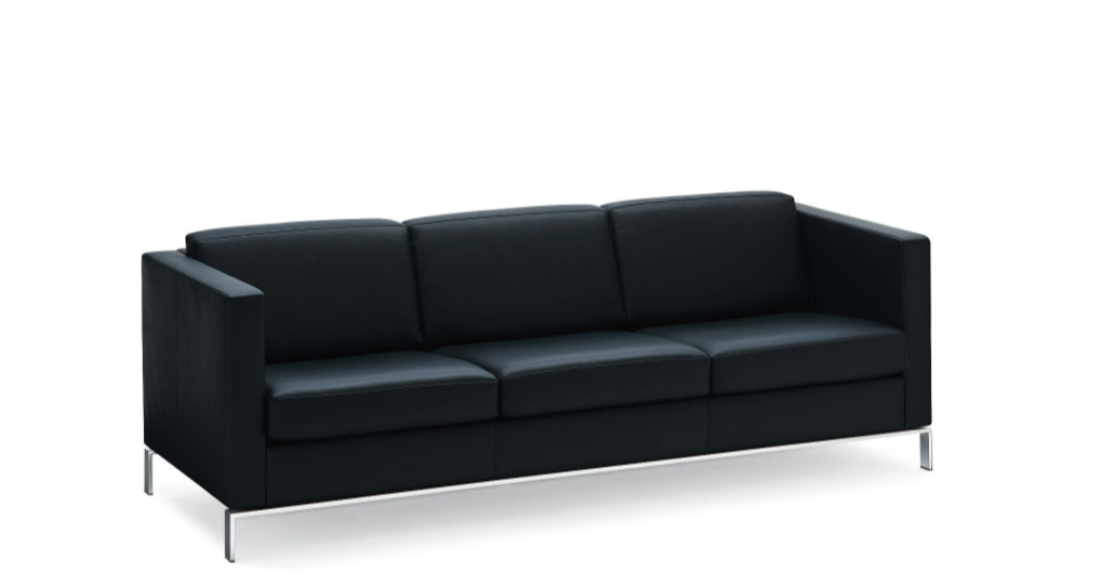 A contemporary and classic range, generously sized, with loose seat and back cushions. Its hallmark is a rigid chrome frame, with geometric leather surfaces suspended precisely above it. Occasional tables and an armchair complete the series.