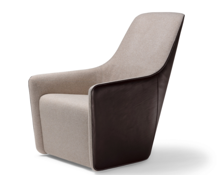 An effortless combination of materials: saddle leather with distinctive markings on the back, natural materials in the seat. The intricately worked stitching emphasizes the sweeping lines. It swivels easily or rests on feet – for longer periods of sitting during conferences or at a table. The separate stool completes the standalone chair.