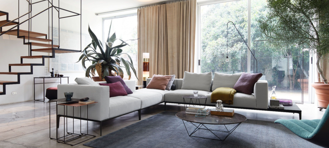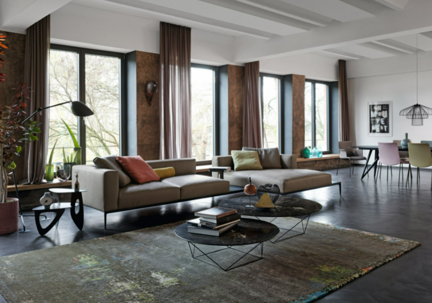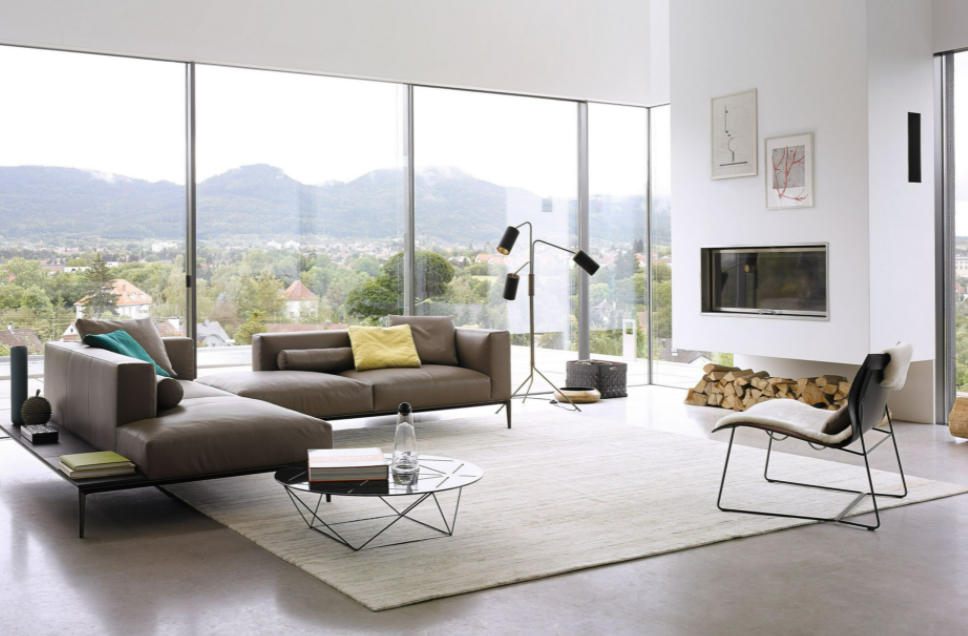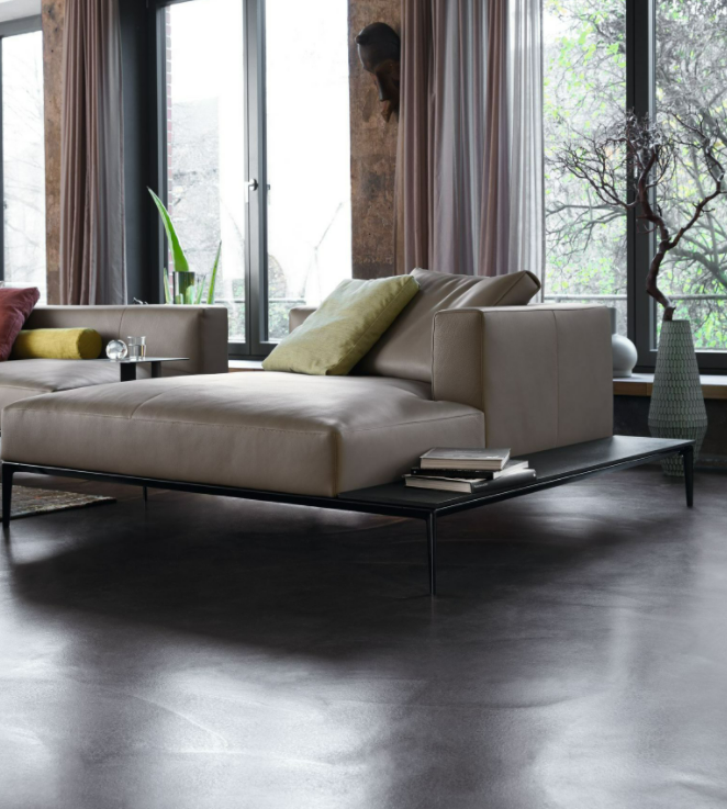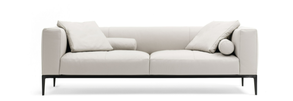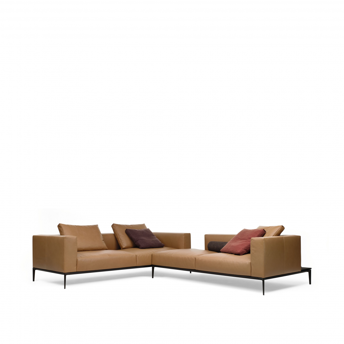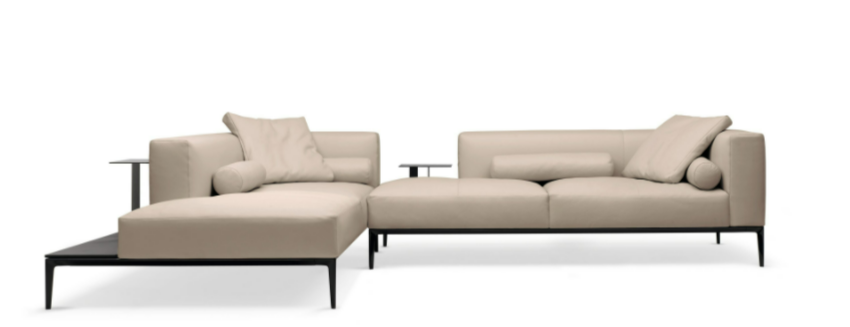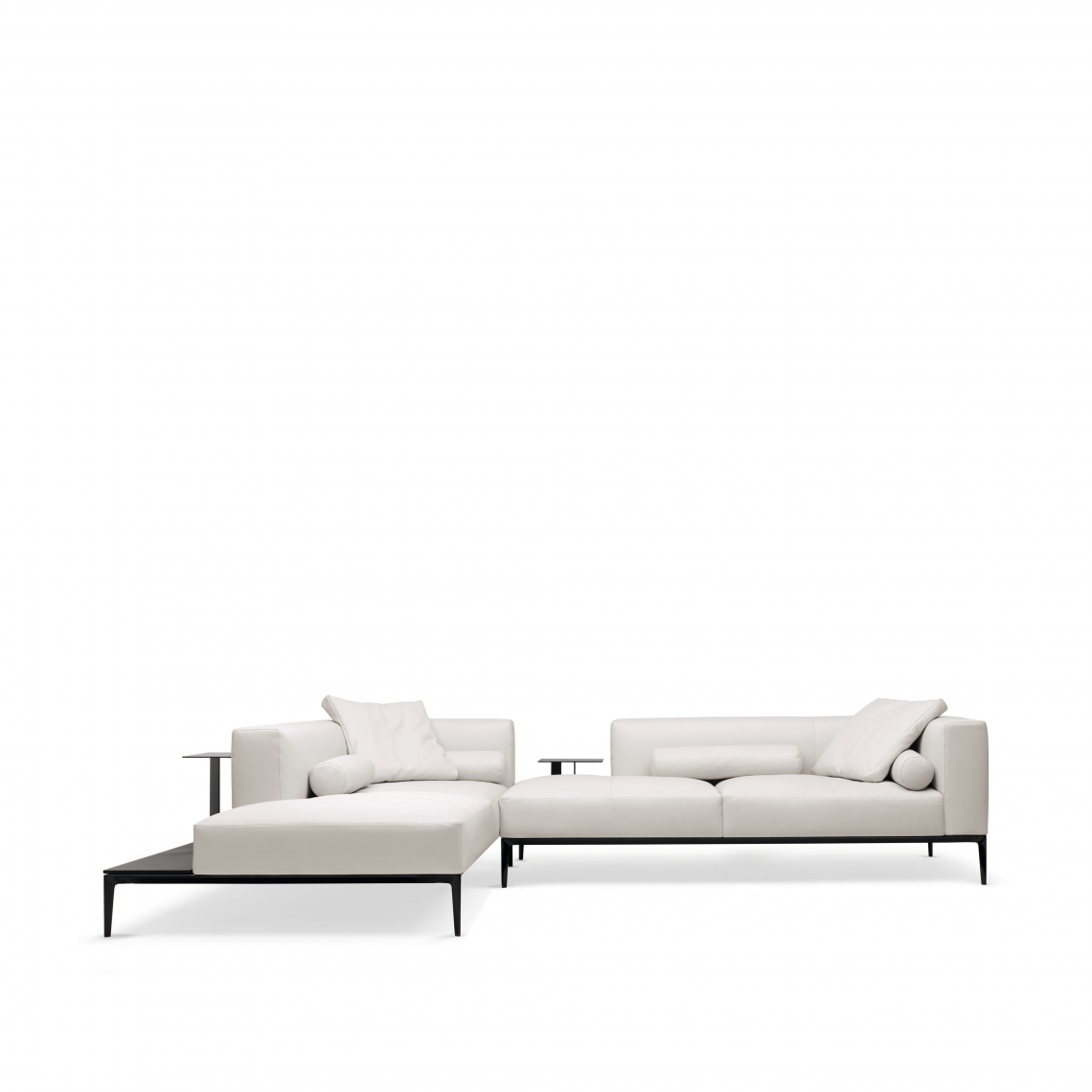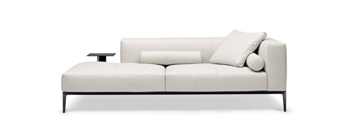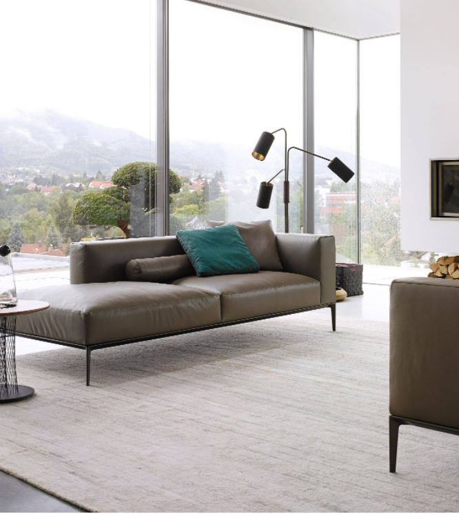 The generous upholstered surfaces of sofa and chaise longue unfold over the delicate frame and appear to be floating, in a balanced harmony of lightness and weight. Chic and inviting at the same time: the casual look of the leather complemented by the light down filling of the upholstery. A softness you want to sink into forever.