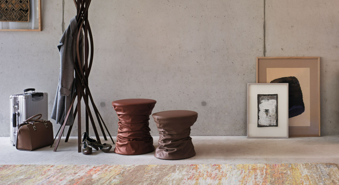 The non-slip leather and fabric of this stool are gathered in soft folds. The height of this innovative piece can be changed with a simple movement of the hand. The circular lever for the height adjustment is hidden in the seat. As a duo, a group, or in addition to a sofa.