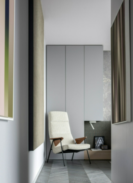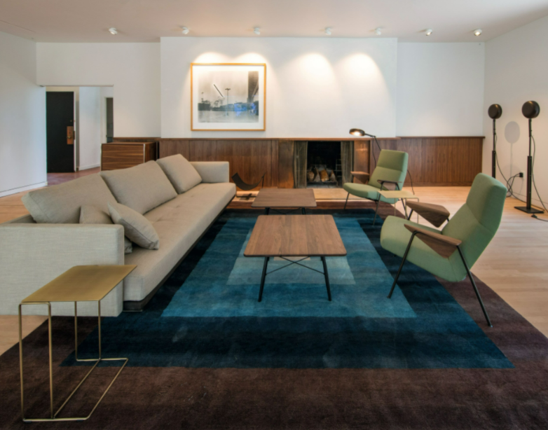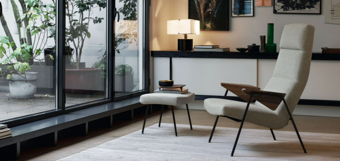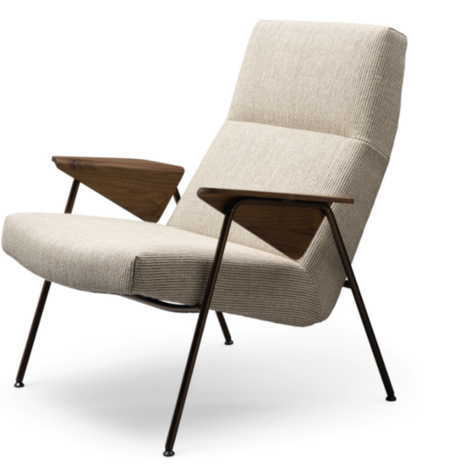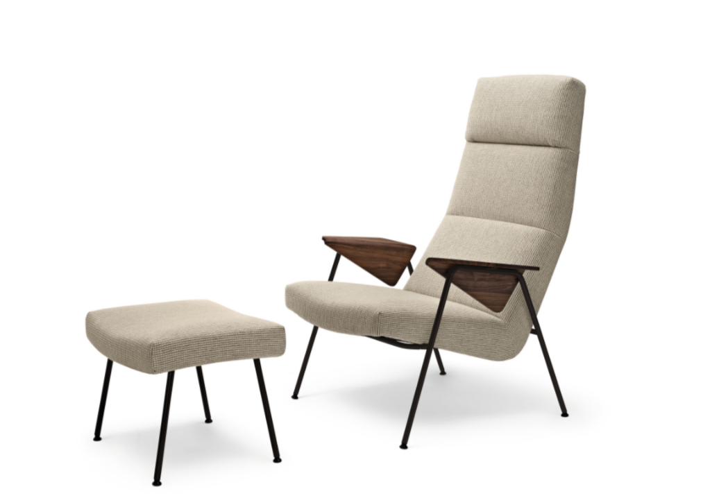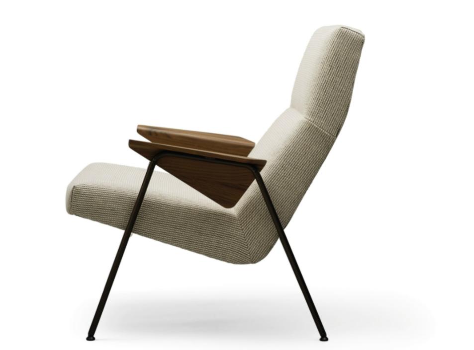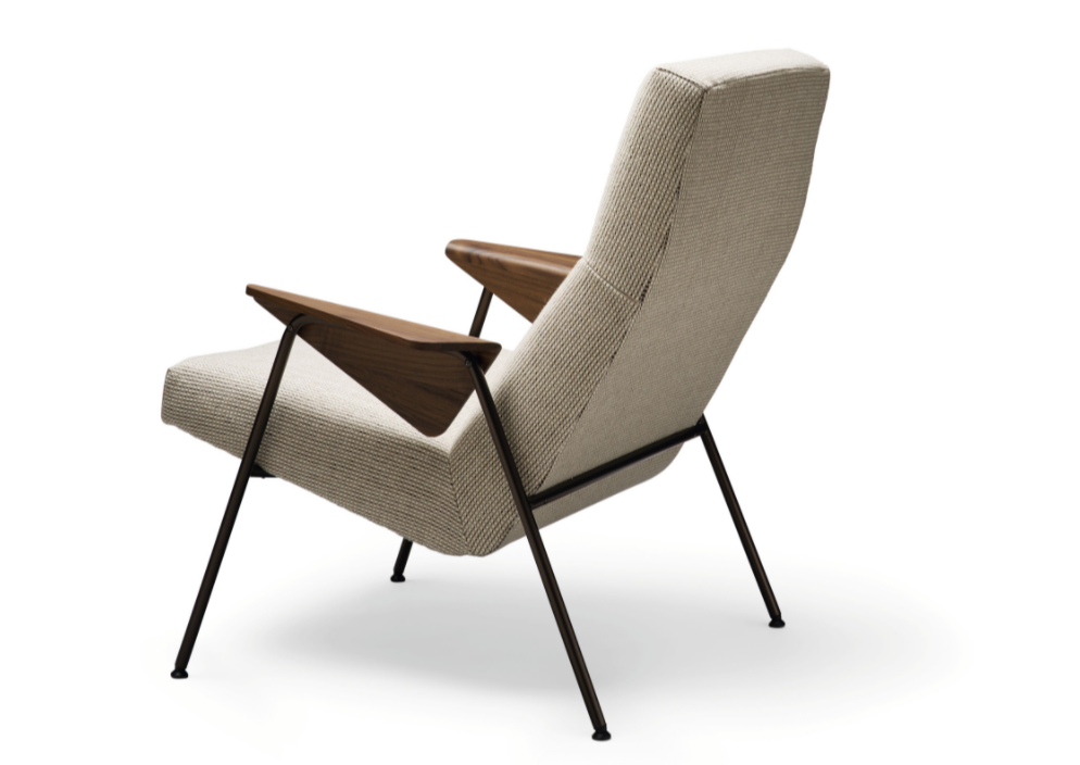 A quiet classic of mid-century modernism: the emphatically angular volume of the upholstery rests on a delicate tubular steel framework, with elegantly shaped armrests in solid wood. Available with a high or low backrest, and accompanying stool. Timeless elegance for restful spaces, in private and in public.