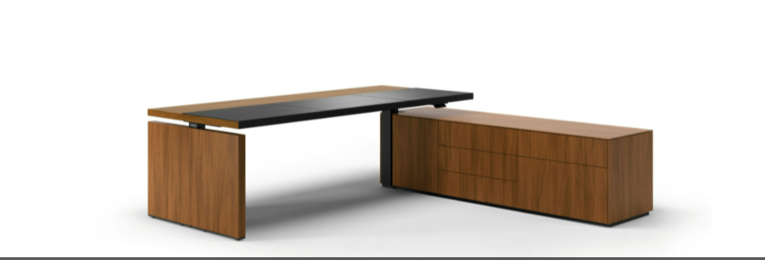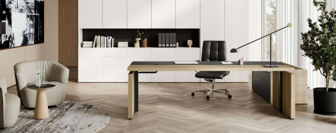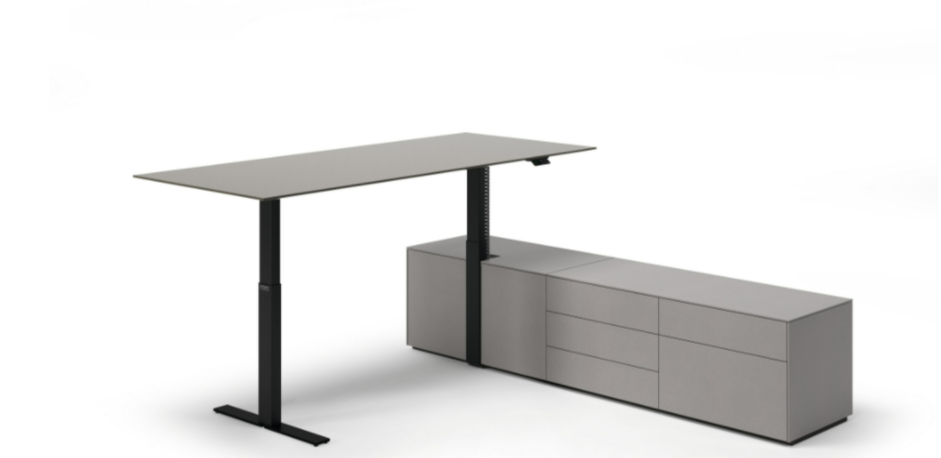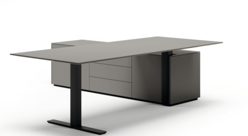 A workbench for leaders: the graphic lines and bridge shape of the executive desk stand for architectural clarity. Projects can be sorted and structured on the large desk top. The height adjustment function allows different positions to be taken at the desk. Valuable and customizable.