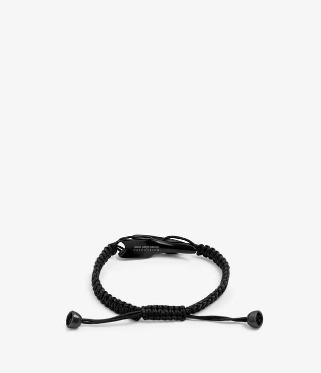 Tyne Bracelet with Macrame Band, in brushed stainless steel. Informed by the mathematical principle of minimal surface, interweaving without constraint, the result is a collection that maximises tactility through the interplay of solid and void.