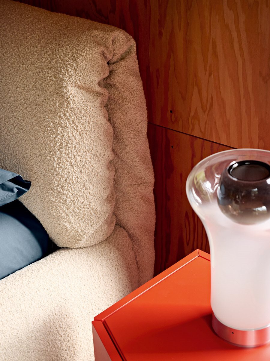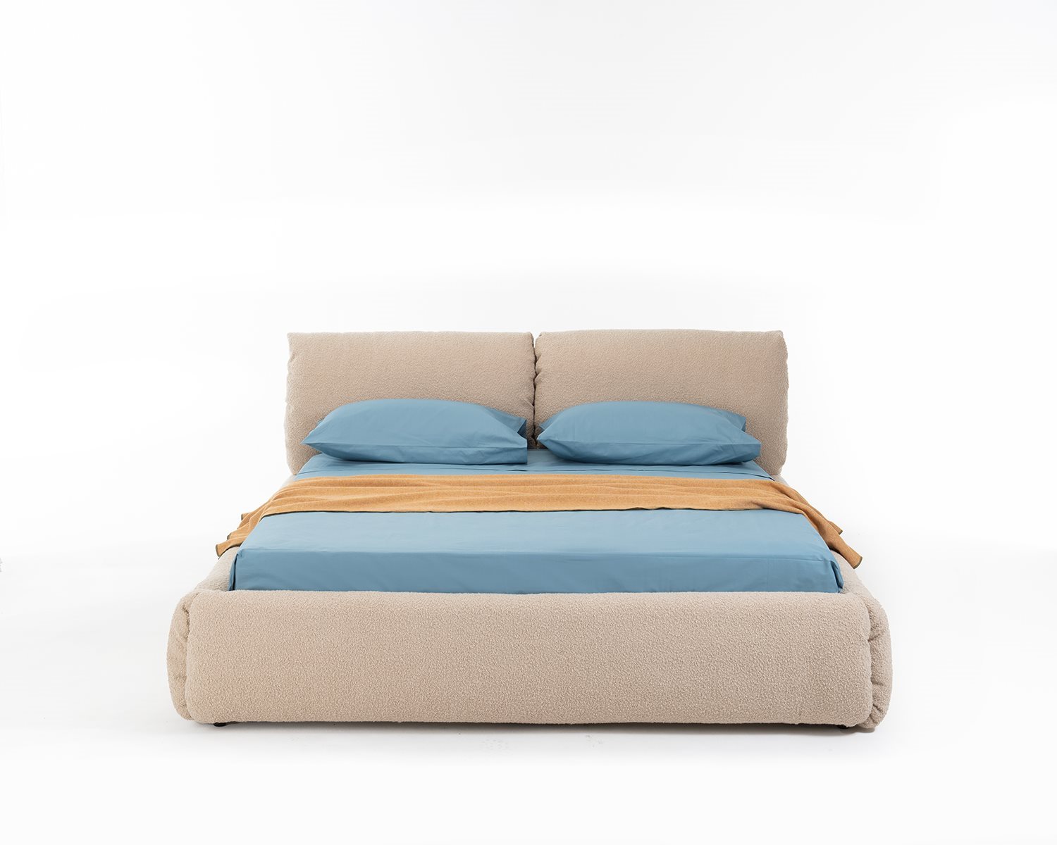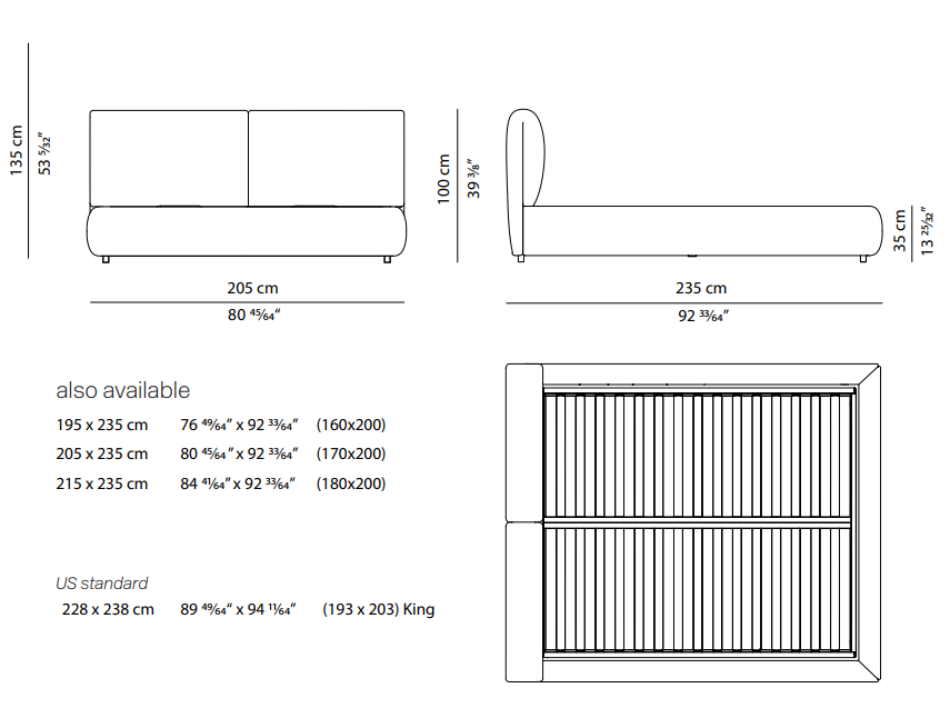 Bed with container unit. Base and headboard in MDF upholstered with regenerated and regenerable polyester balls. Aluminium varnished steel springing frame. Suspension in natural bent beech strips. Internal regenerated and regenerable polyester fabric; removable fabric cover. The bed fitted inside the base, is furnished with a container unit accessed by lifting the springing with a special device.