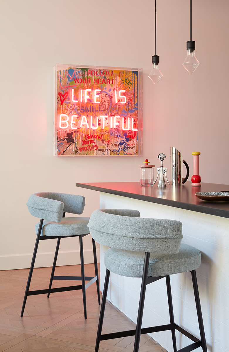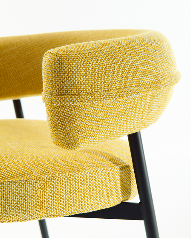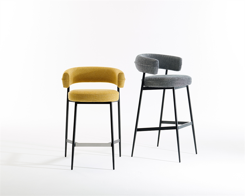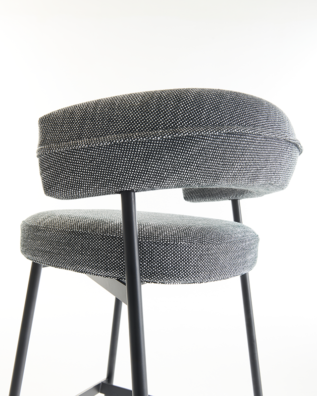 凳子。石墨黑或啞光黑色漆面鋼架機構。坐墊填充漸變聚氨酯,靠背填充自熄性聚氨酯泡沫。可拆卸布料或皮革護套。覆面擱腳采用緞面不銹鋼制成。