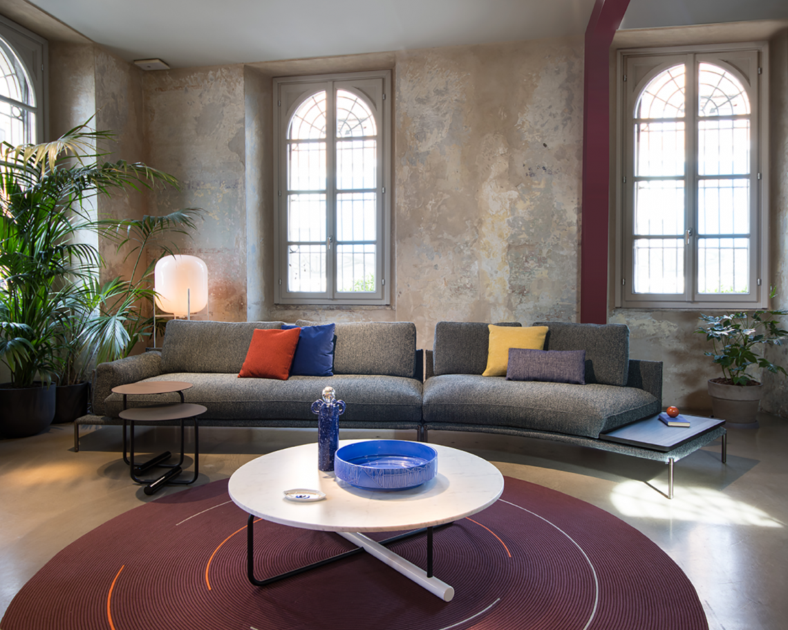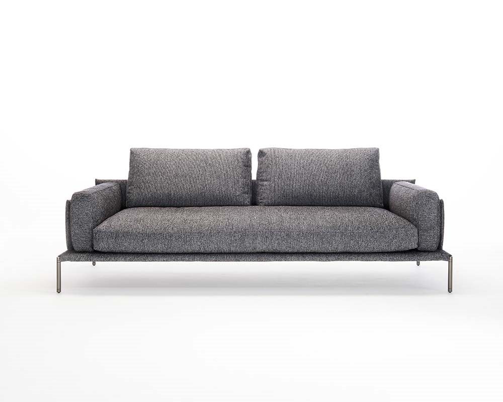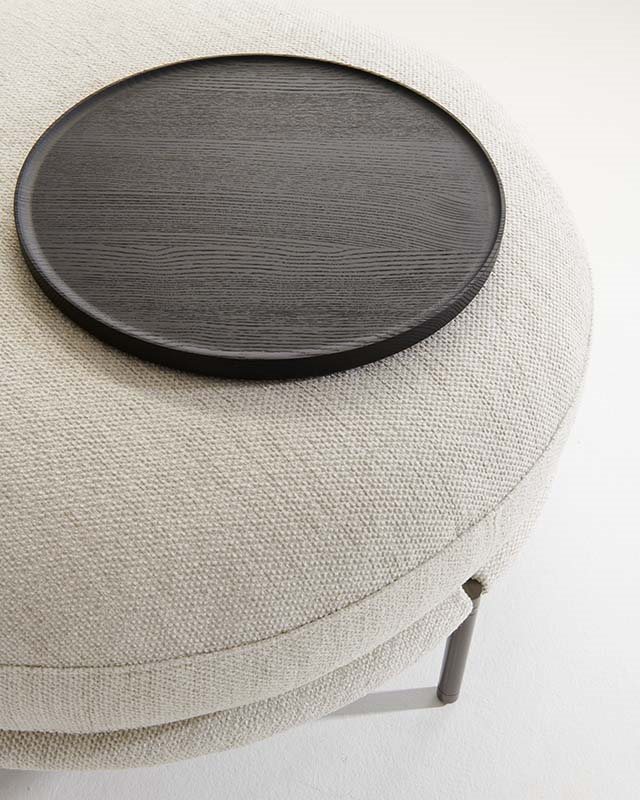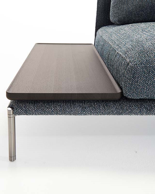 拋光黑色鍍鎳緞面或石墨黑漆面鋼質支腳。不銹鋼架結構。彈力條懸掛在結構上。單個坐墊內芯填充再生和可再生充聚氨酯/聚酯絮絨。靠墊內芯填充100%新鵝絨。再生和可再生聚酯絮絨作為扶手墊內芯填充物。筆直與彎型終端元件可配備扶手墊,或在沙發的支撐底座上配備開放式黑漆實心白蠟木托盤。表面覆蓋可拆卸面料或真皮。 配備直徑為45厘米的開放式黑漆實心白蠟木托盤,可自由放置在座墊上。四周鑲板覆蓋與抱枕同樣的面料或真皮。