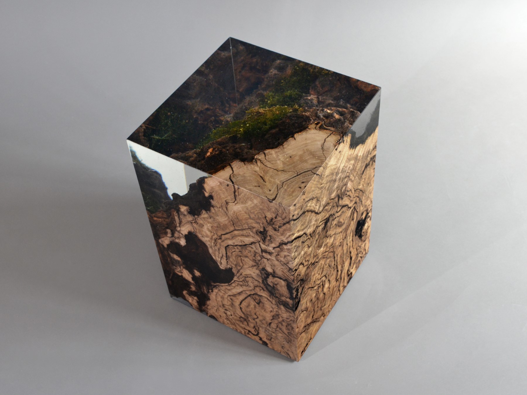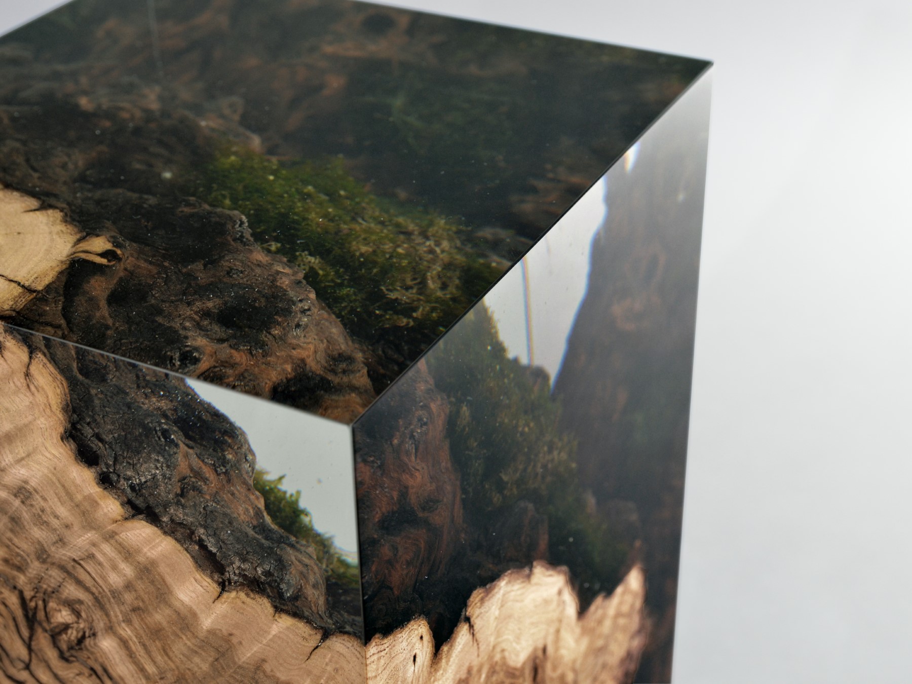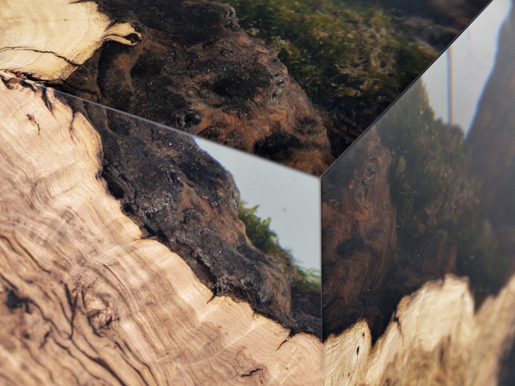alcarol recover discarded pieces of Burled Chestnut log from a wetland of the Italian Dolomite countryside and preserve the natural bark surface with its native populations of plants, which are embedded in a transparent resin resembling the habitat water that generated their life.