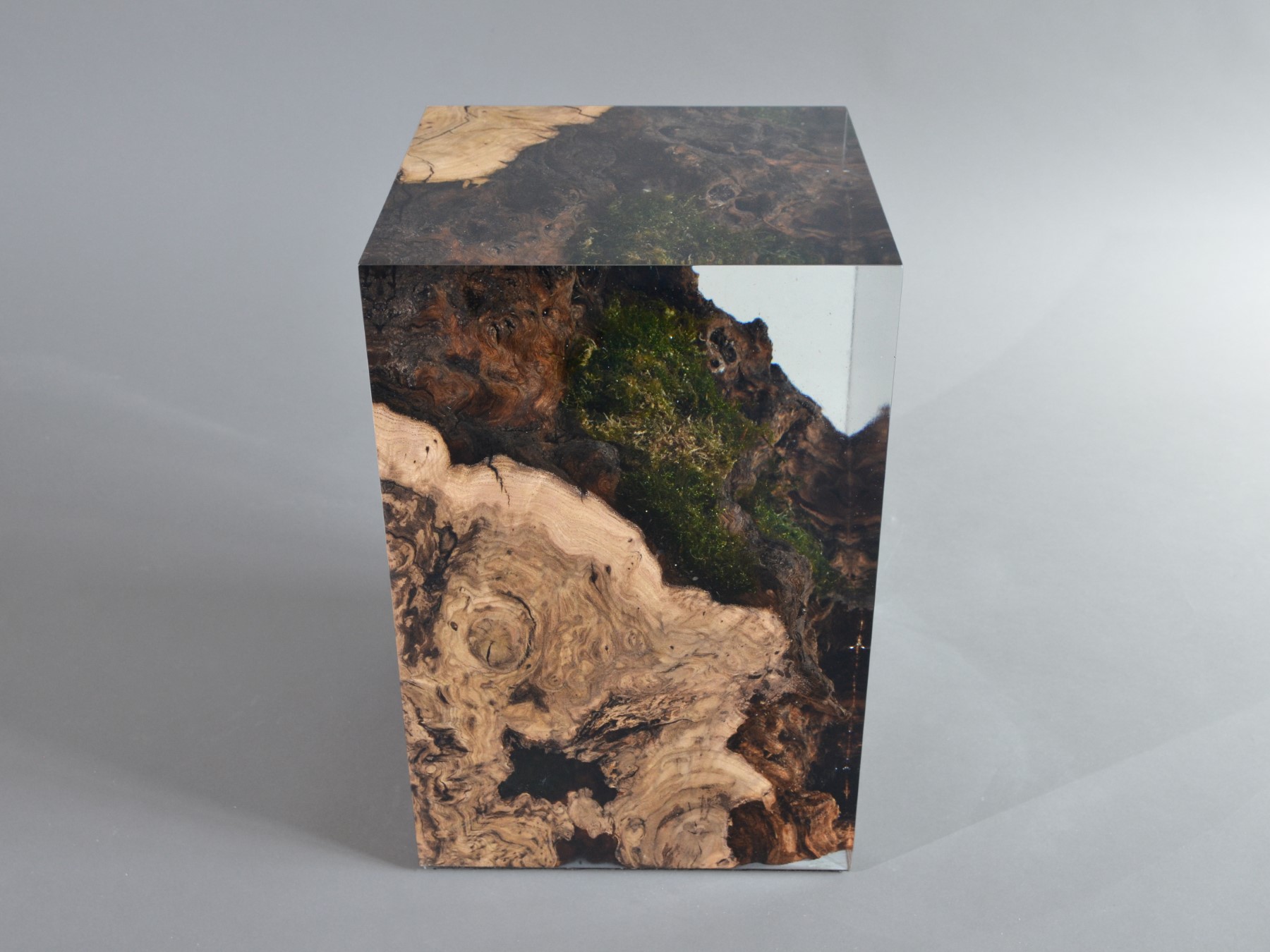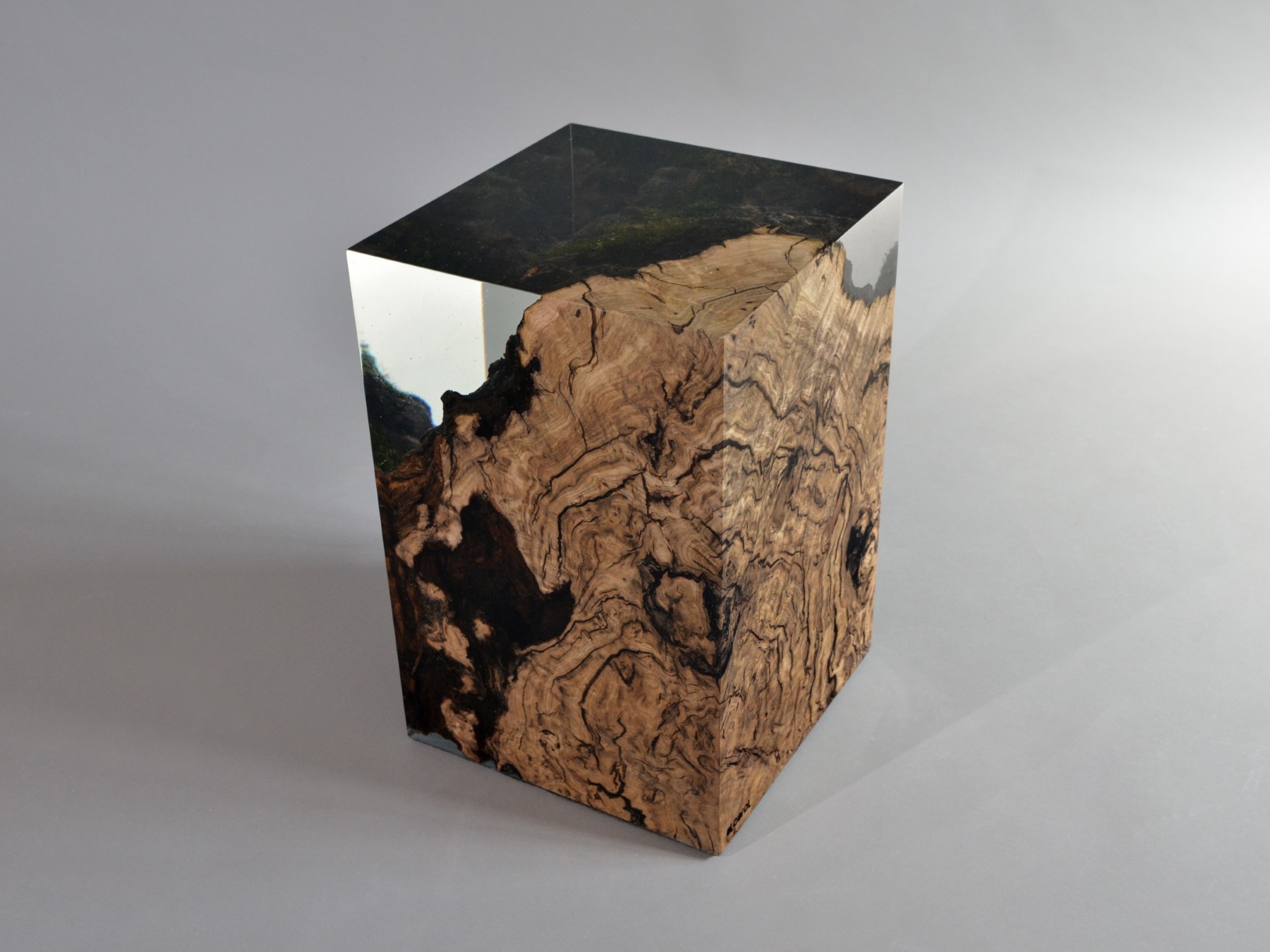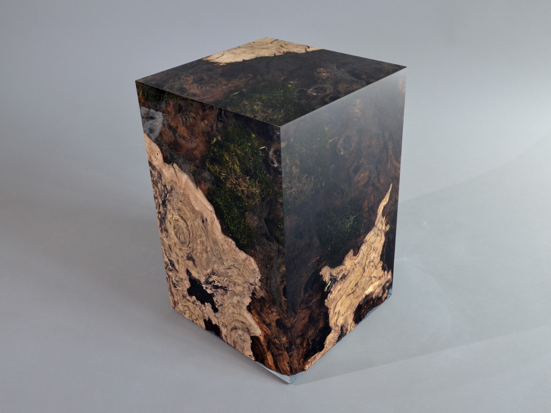 alcarol recover discarded pieces of Burled Chestnut log from a wetland of the Italian Dolomite countryside and preserve the natural bark surface with its native populations of plants, which are embedded in a transparent resin resembling the habitat water that generated their life.