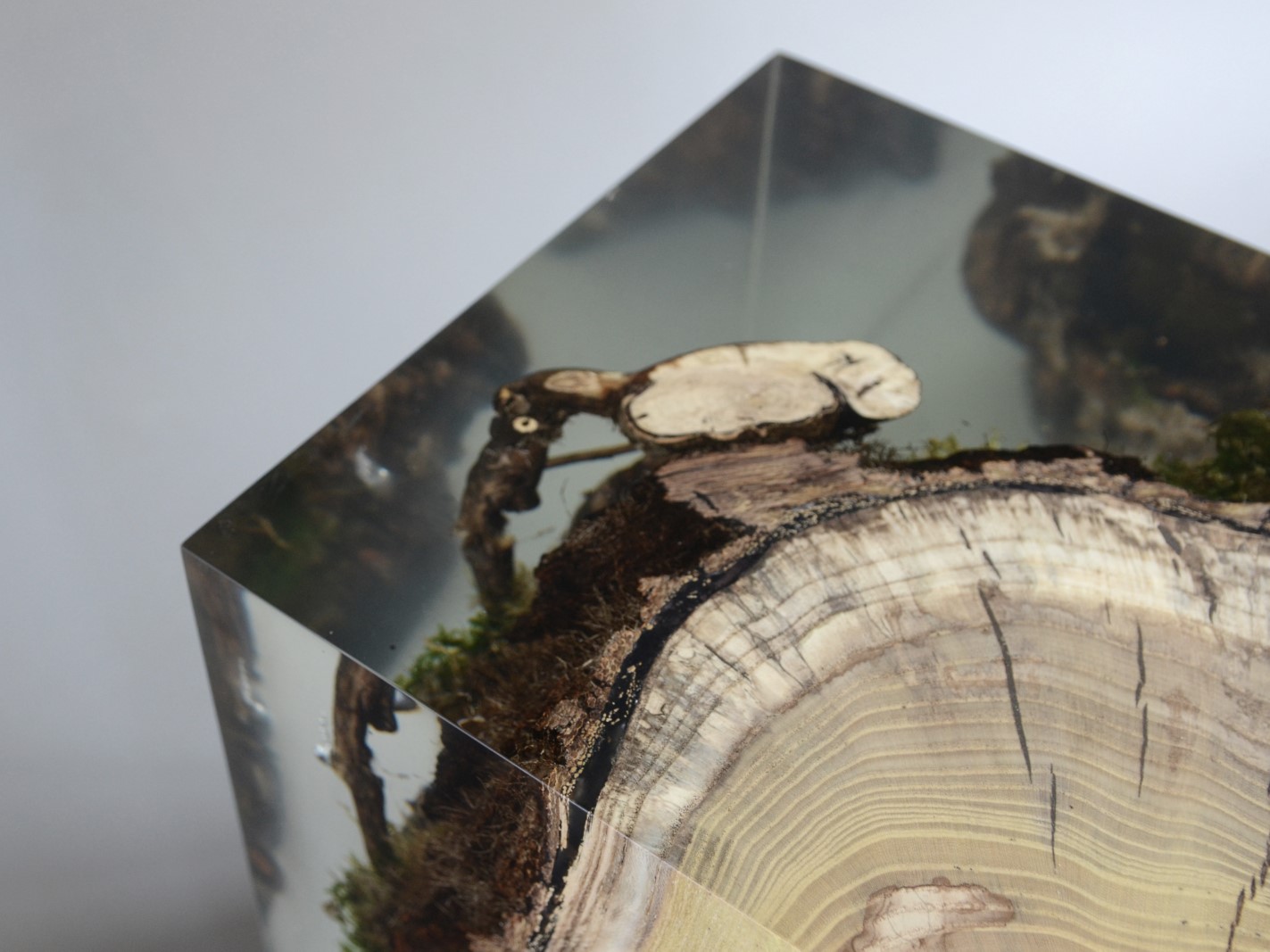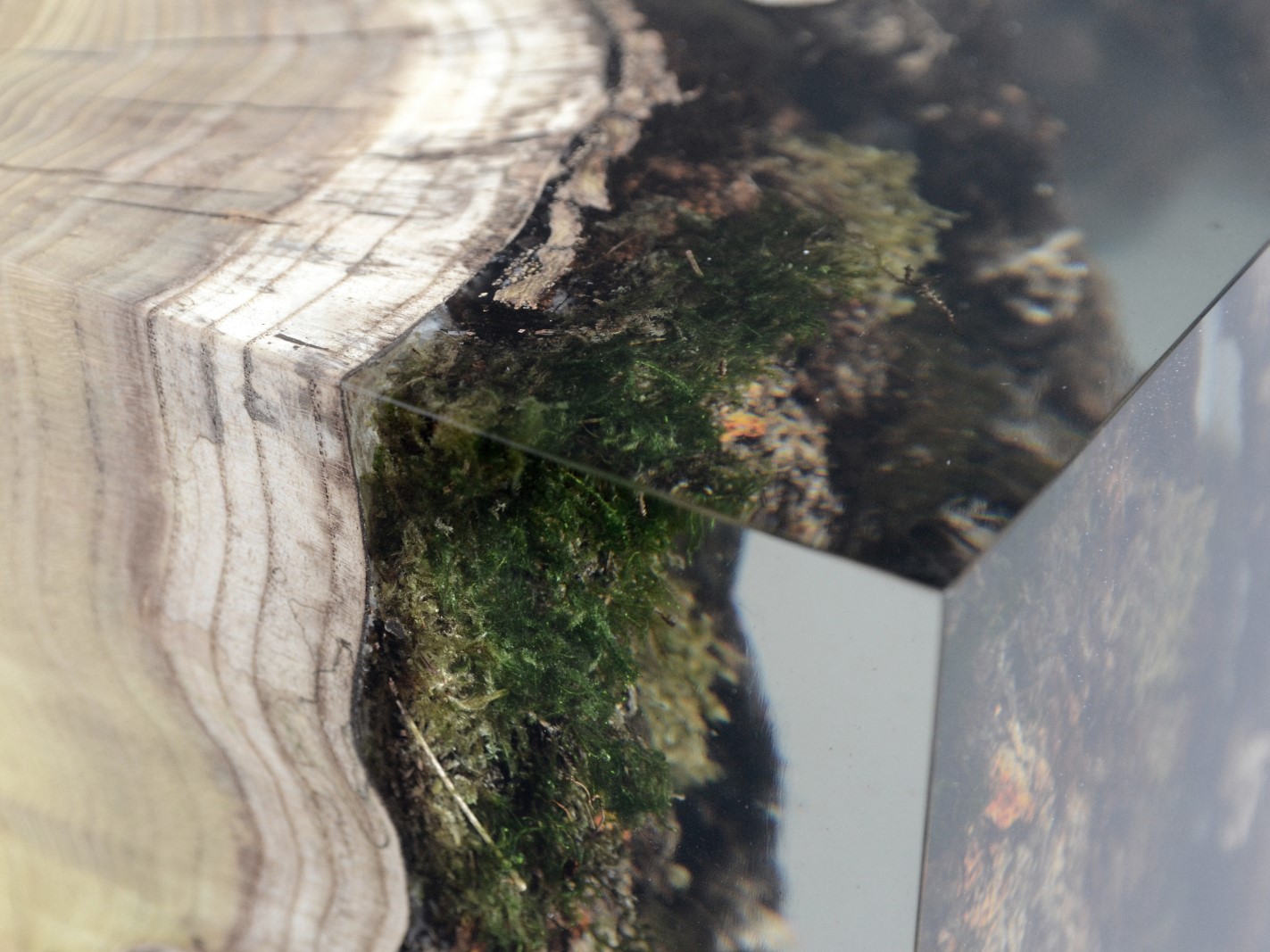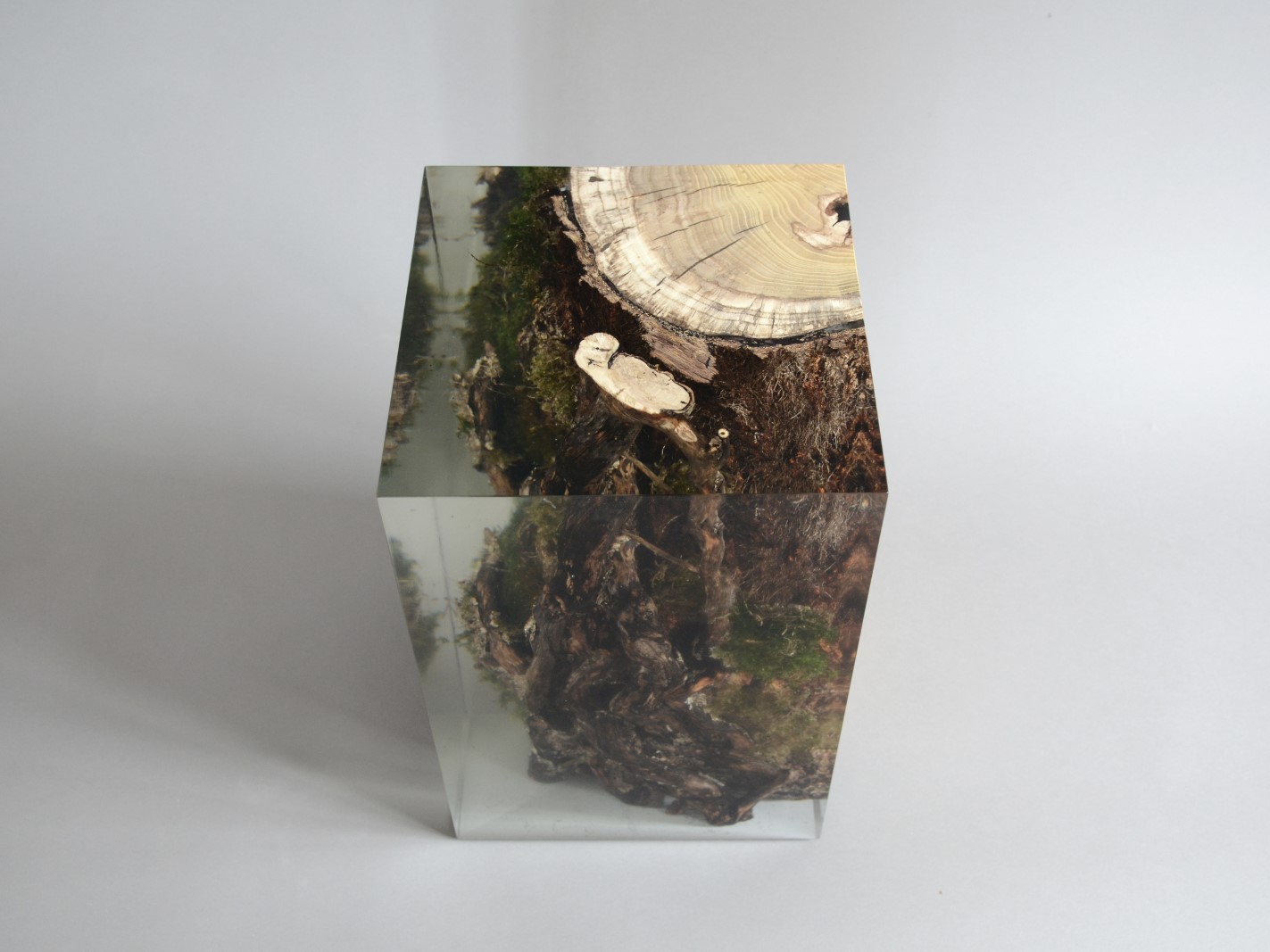alcarol recover discarded pieces of Mulberry log from a wetland of the Italian Dolomite countryside and preserve the natural bark surface with its native populations of plants, which are embedded in a transparent resin resembling the habitat water that generated their life.