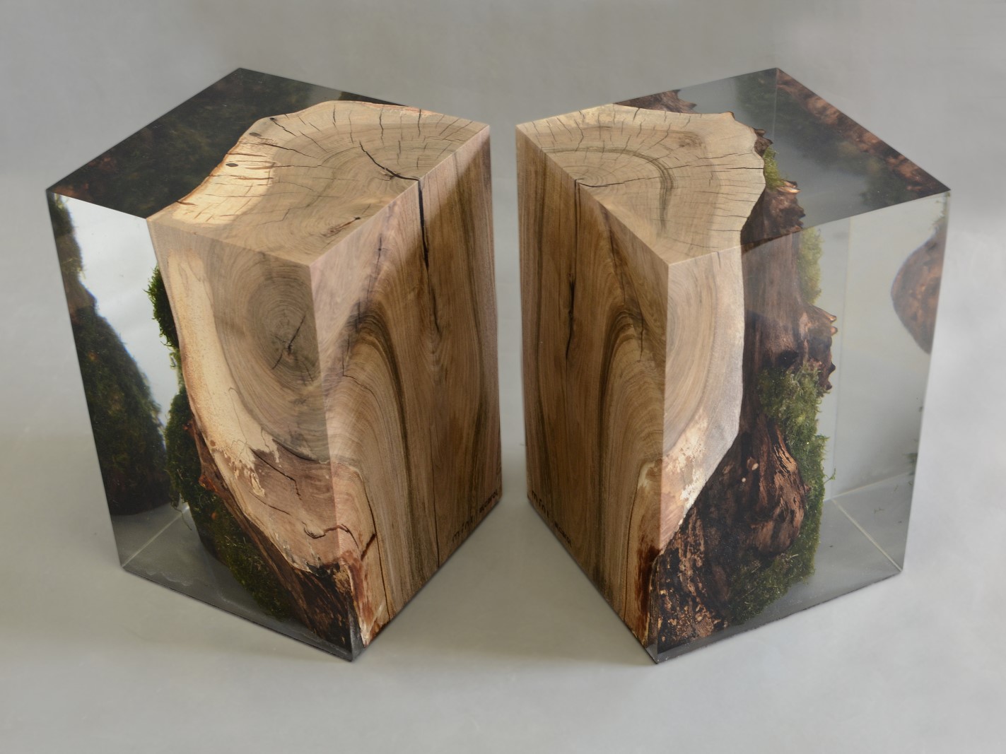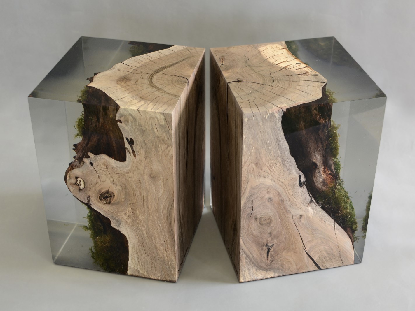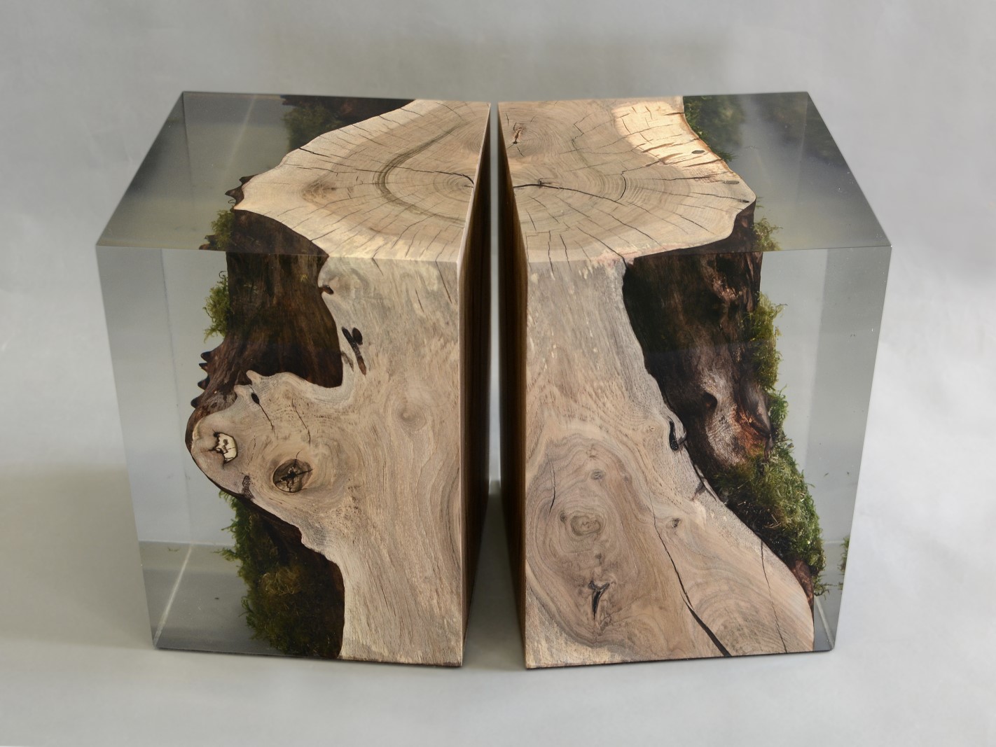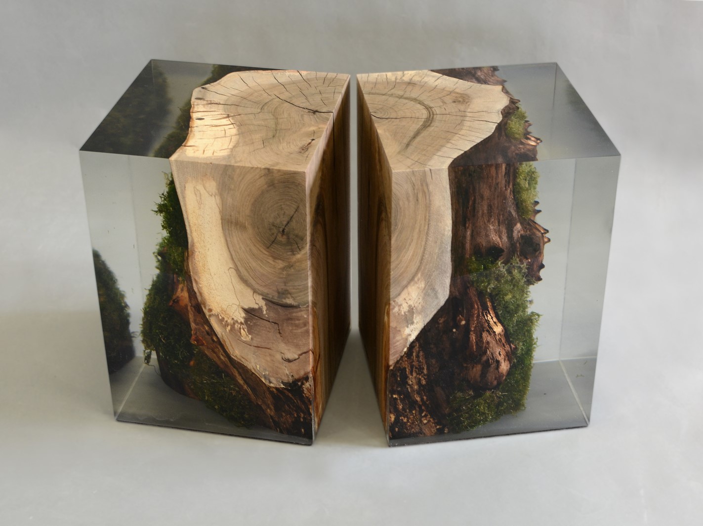 alcarol recover discarded pieces of logs from the undergrowth of the Italian Dolomite mountains and preserve the natural bark surface with their native populations of plants, which are embedded in a resin resembling the water that generated their life.