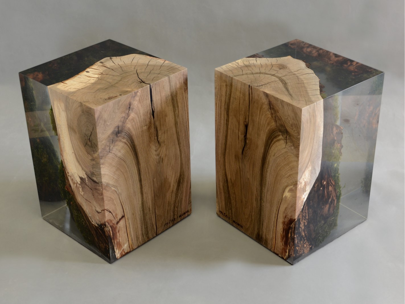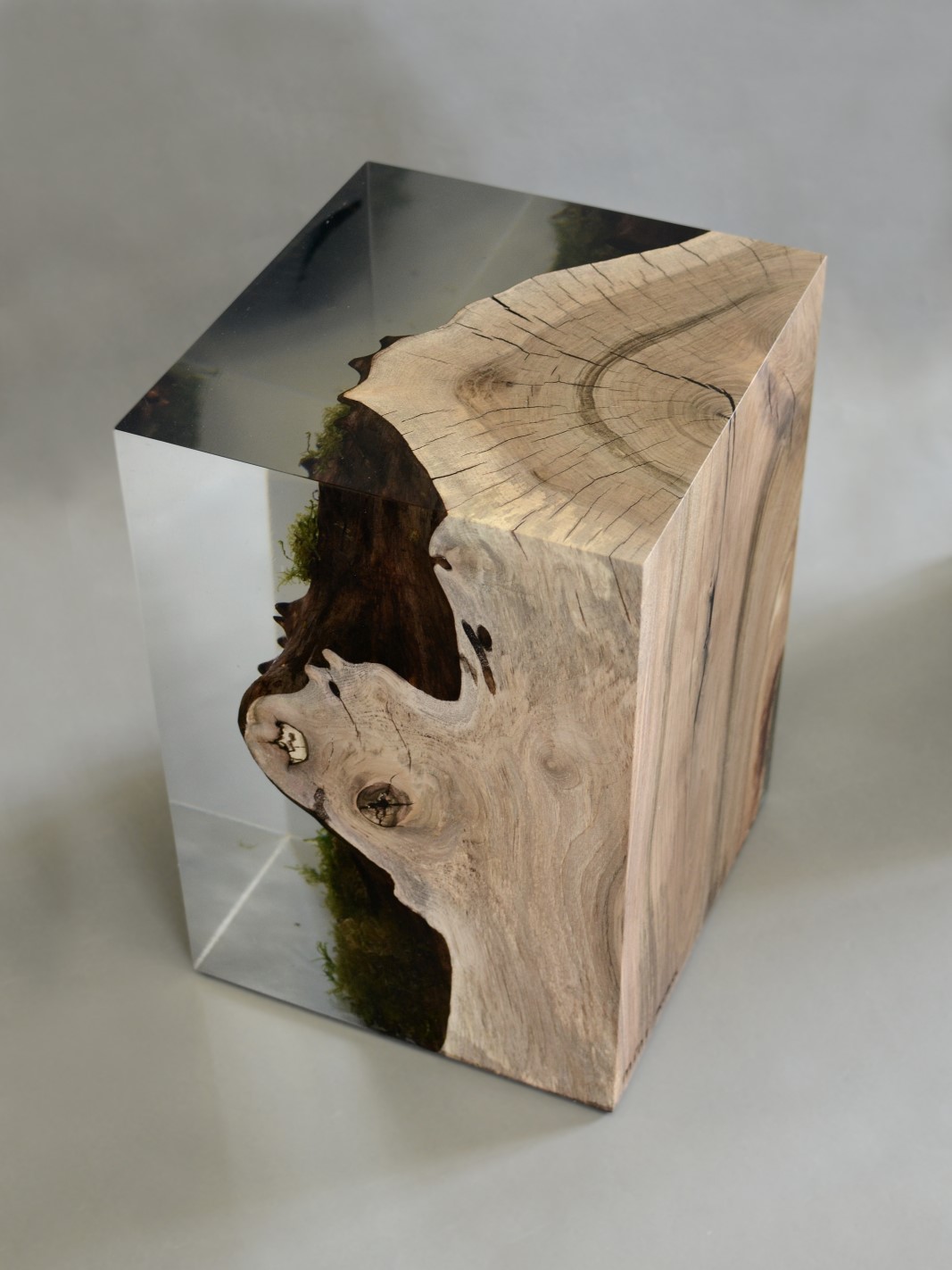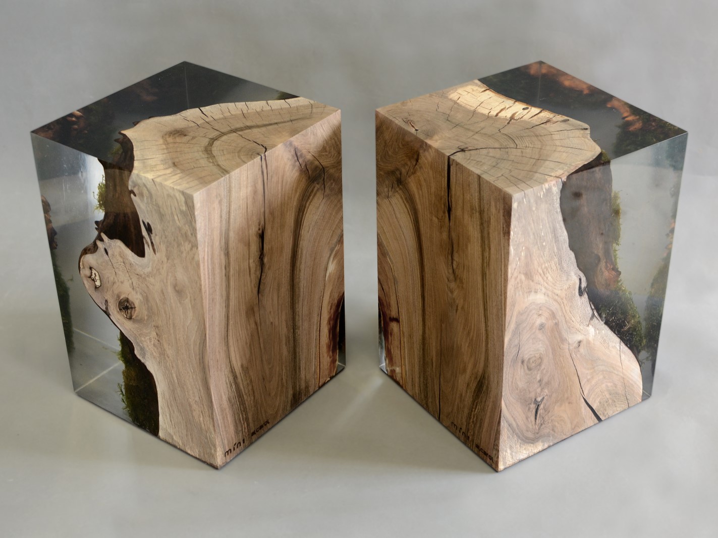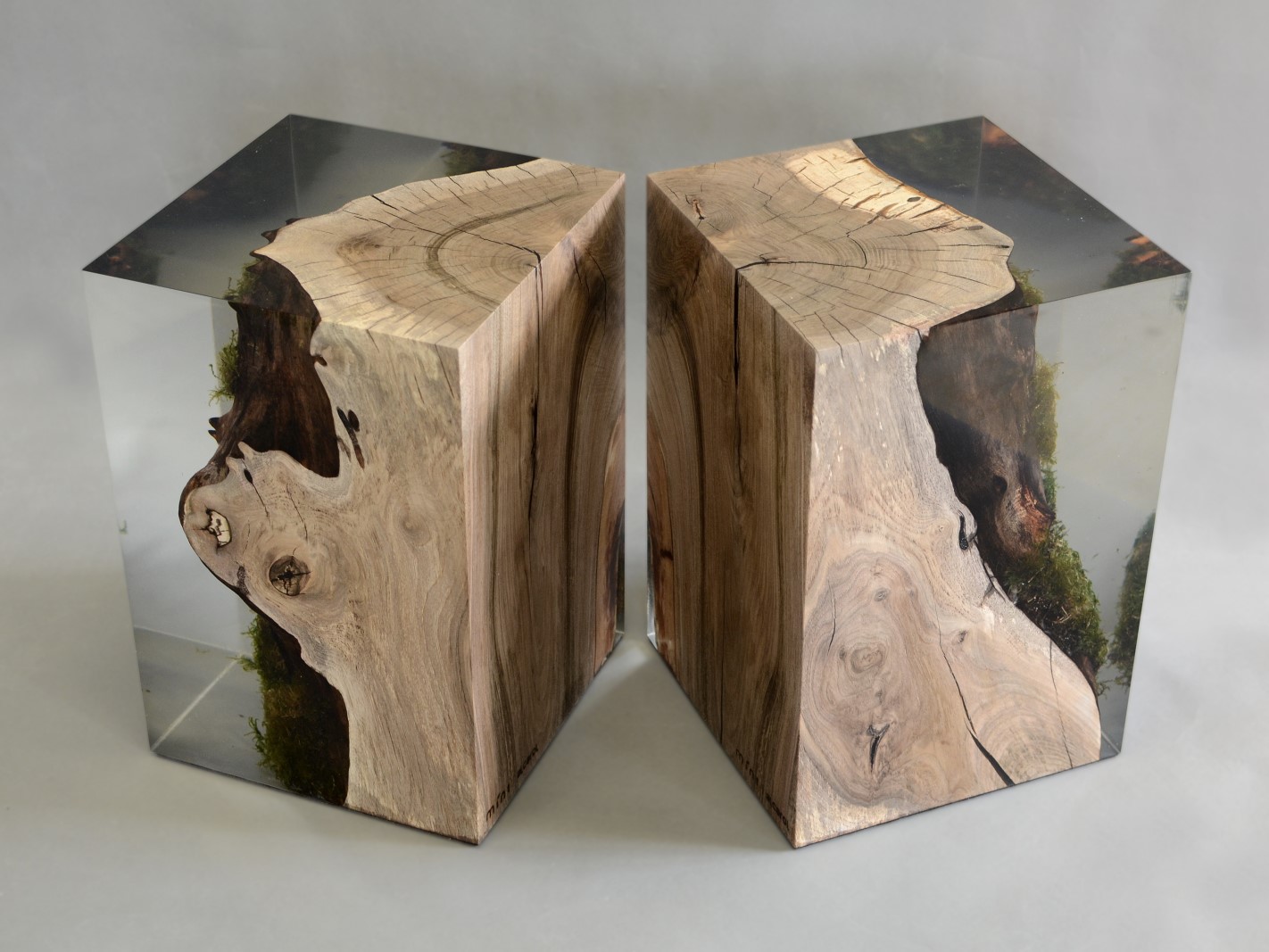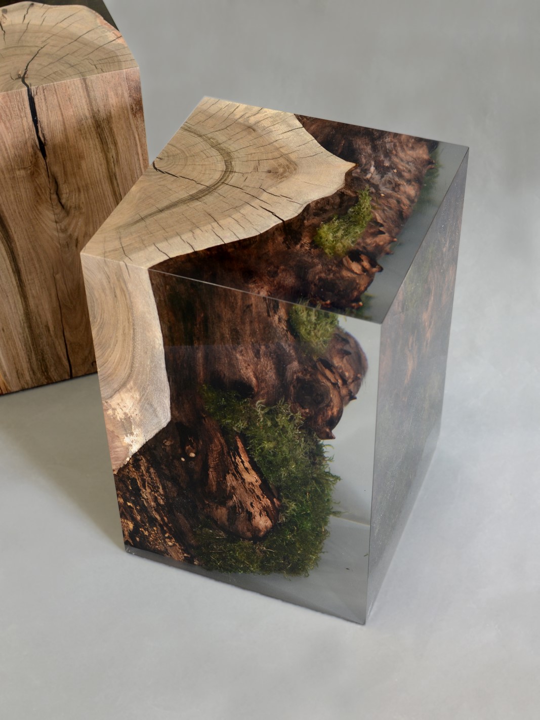 alcarol recover discarded pieces of logs from the undergrowth of the Italian Dolomite mountains and preserve the natural bark surface with their native populations of plants, which are embedded in a resin resembling the water that generated their life.