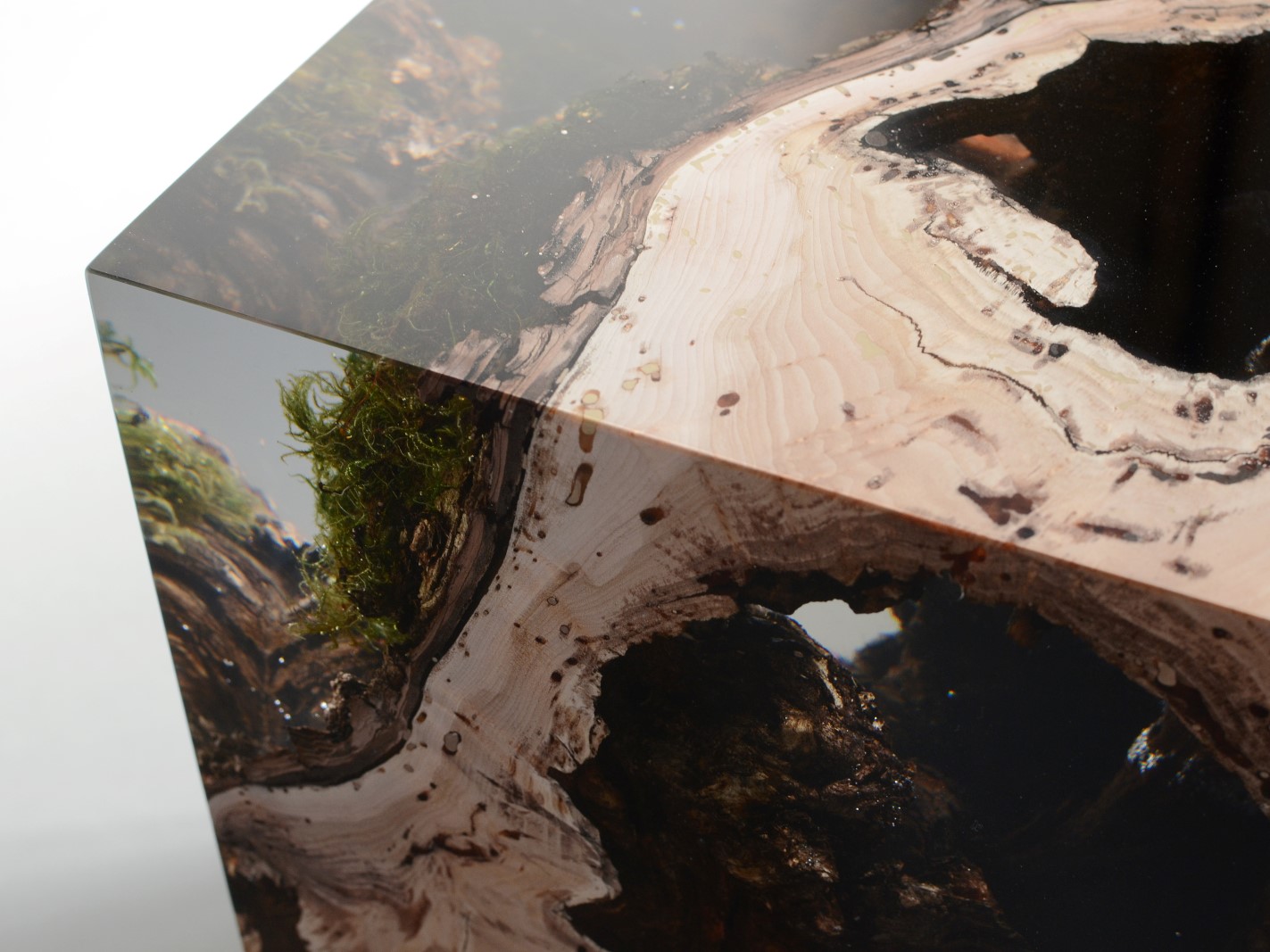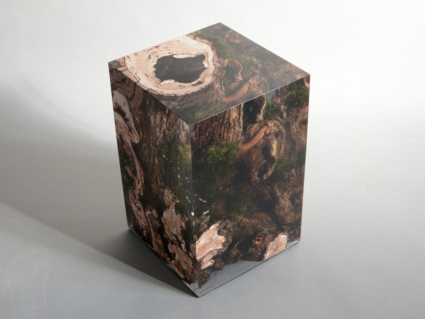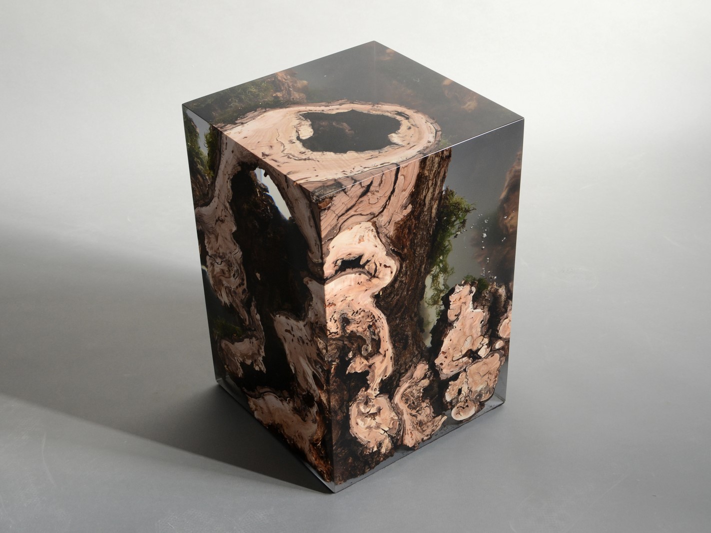 alcarol recover discarded pieces of logs from the undergrowth of the Italian Dolomite mountains and preserve the natural bark surface with their native populations of plants, which are embedded in a resin resembling the water that generated their life.