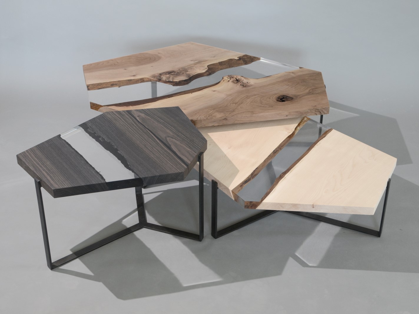 The Crystal Wood Trio is inspired by the process of crystal formation and growth that extends in many directions and heights, with the aim to connect the organic shapes of wood with the rigid geometries of the minerals.