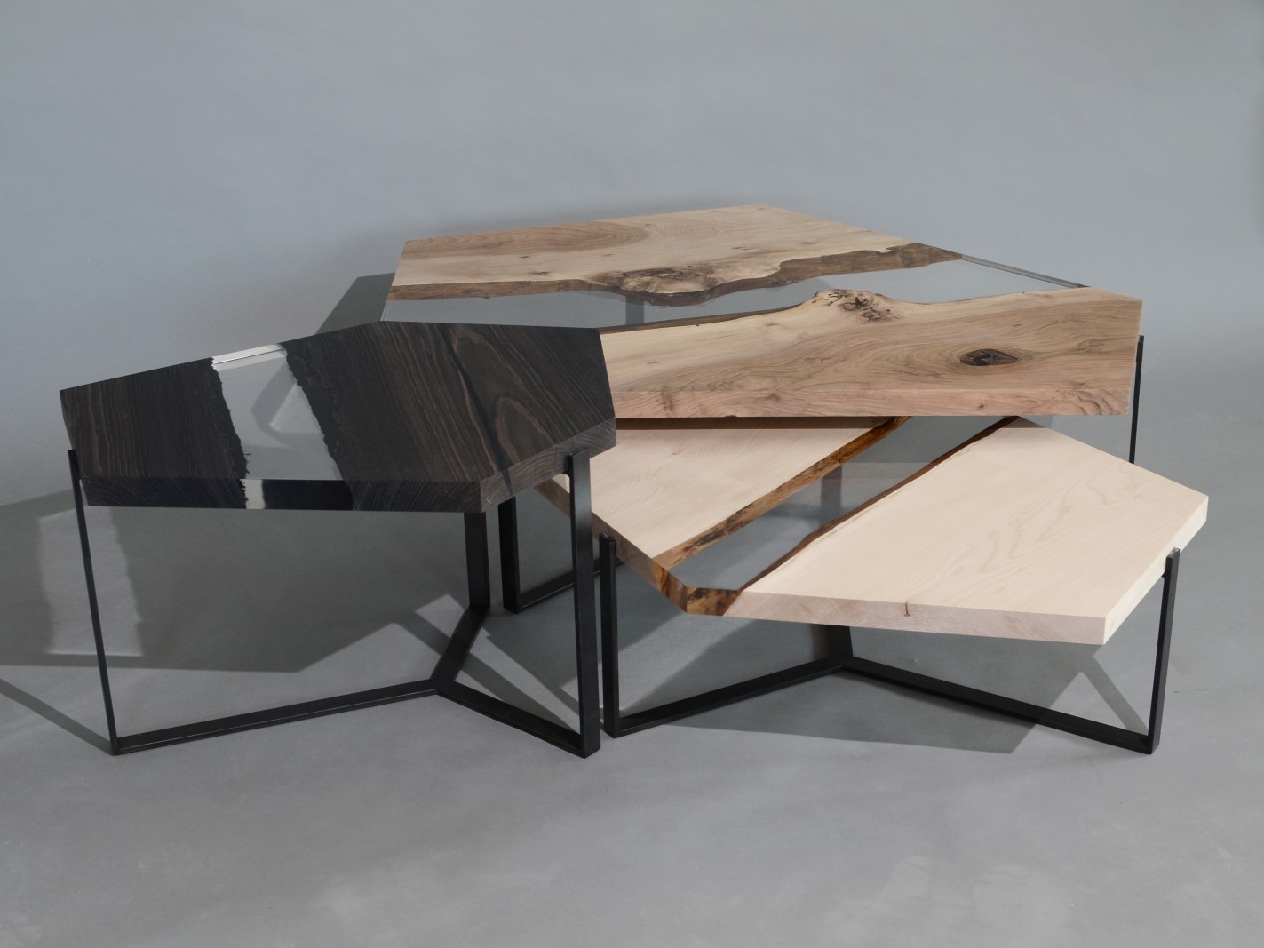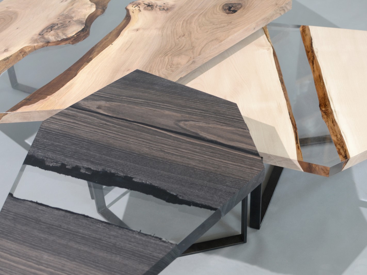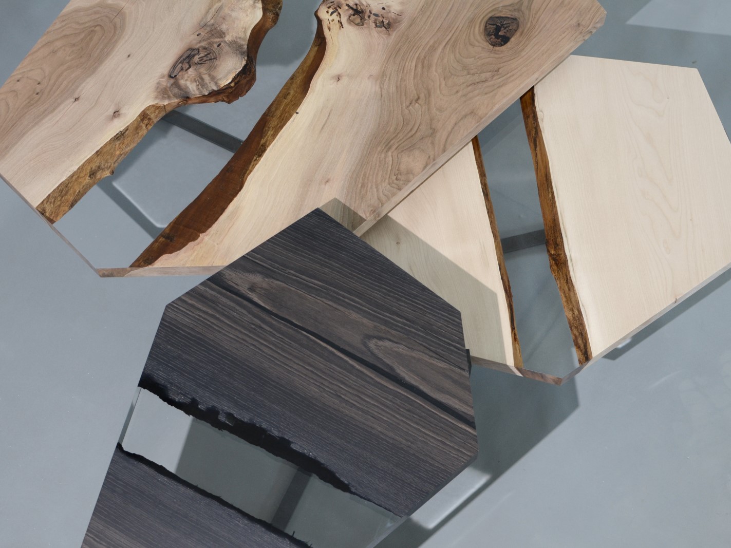 The Crystal Wood Trio is inspired by the process of crystal formation and growth that extends in many directions and heights, with the aim to connect the organic shapes of wood with the rigid geometries of the minerals.
