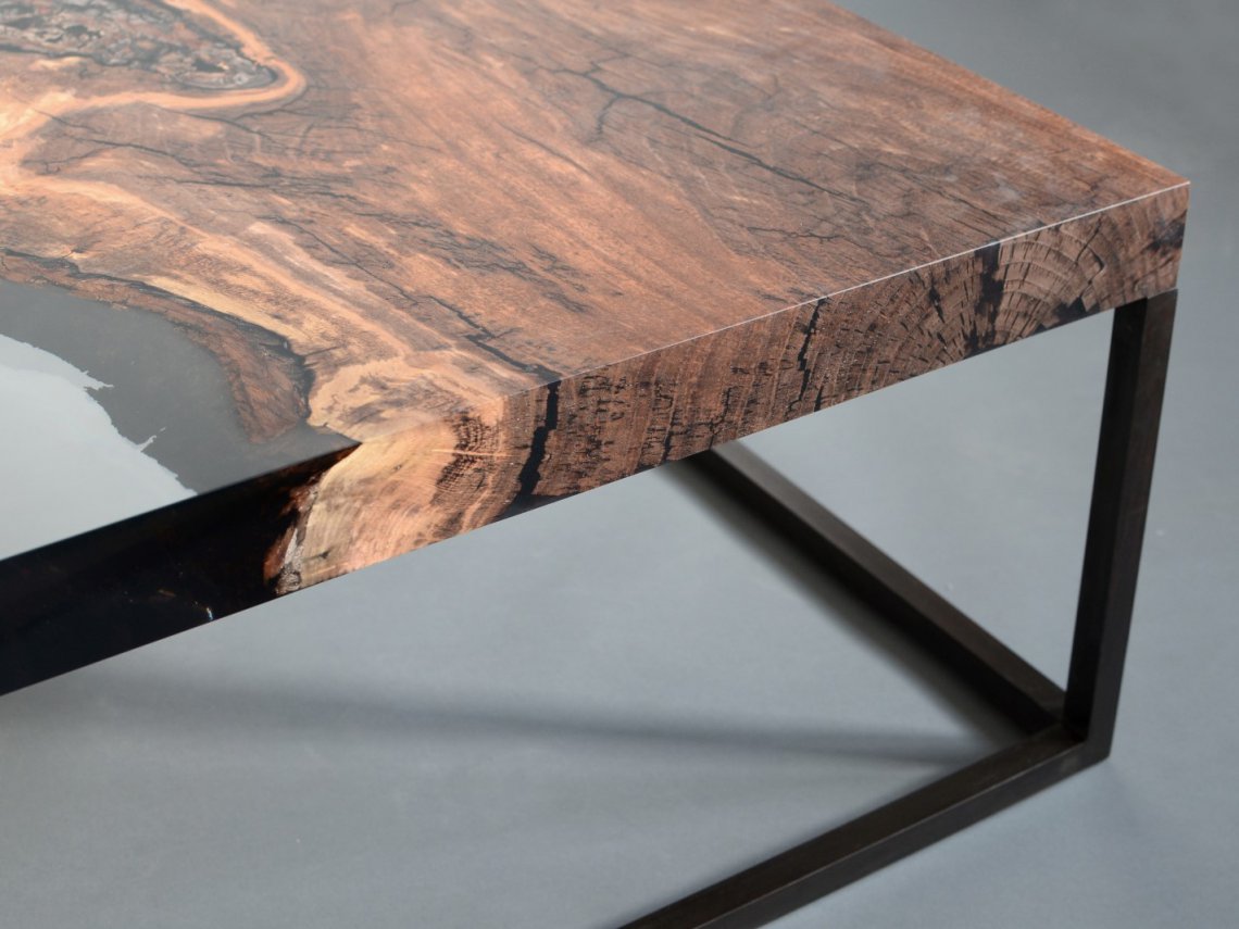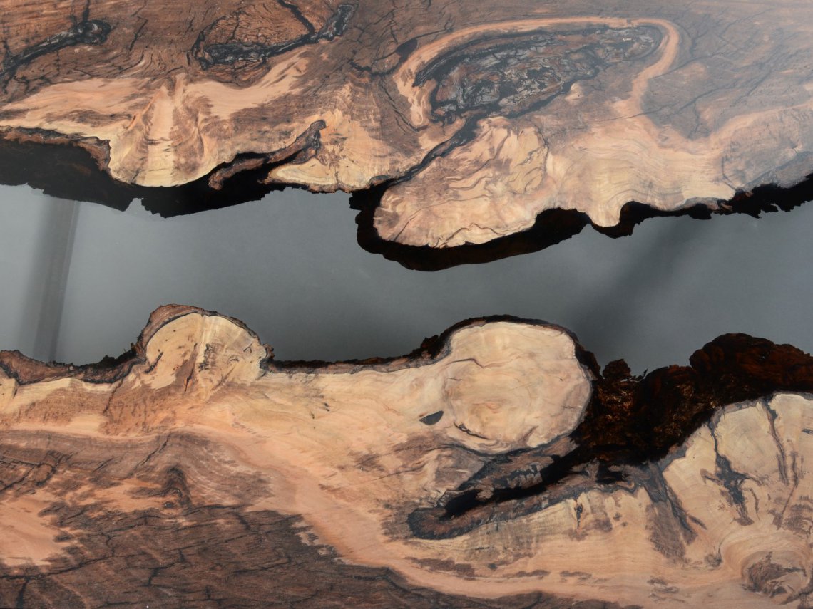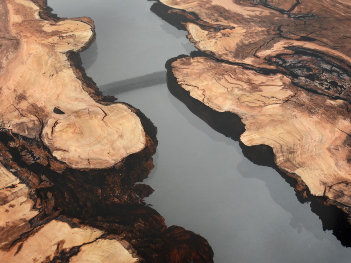 alcarol recover discarded pieces of logs from the undergrowth of the Italian Dolomite mountains and preserve the natural bark surface , which is embedded in a resin resembling the water that generated their life.