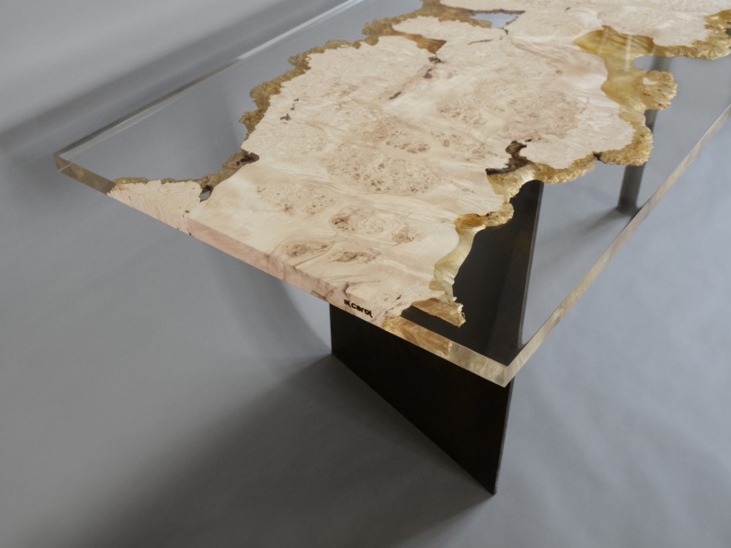 alcarol recovered some burled logs from the undergrowth of the Italian Dolomite mountains and cut planks preserving the natural bark surface and live edges encased in a special resin resembling the water that generated their life.