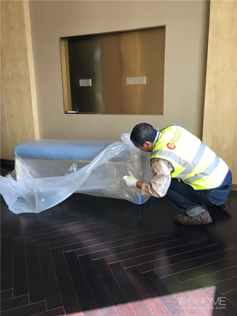 意俱師傅正在拆FENDI ASJA床尾凳的包裝。