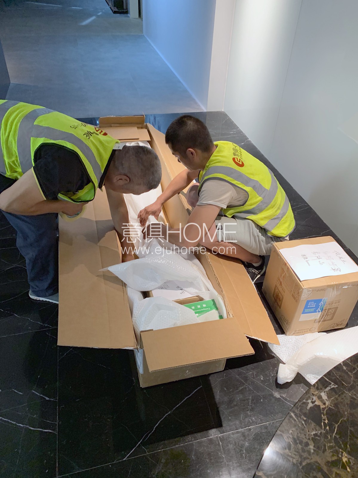 伴隨著西湖、錢塘的美景,意俱的安裝師傅們開始了拆箱、組裝工作。