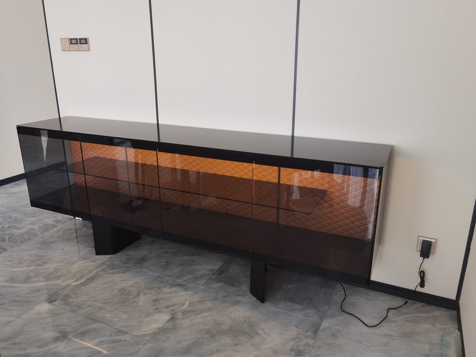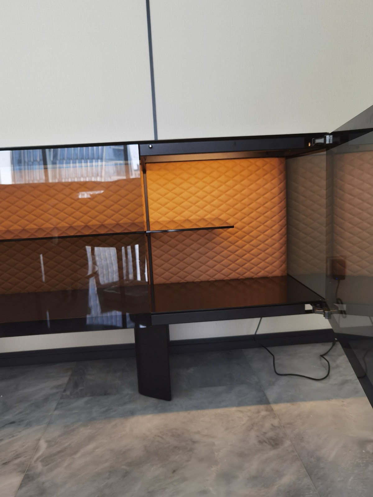一旁的Cattelan Italia餐邊柜意外奪目,Boutique邊柜由設計師Alberto Danese完成,門和側(cè)面采用灰色透明玻璃制成,條紋為黑色彩繪玻璃。頂部和底部采用黑色涂層磨砂玻璃,觸感冰涼溫潤,透明玻璃柜門設計也使得內(nèi)部空間一覽無余,方便了拿找東西。