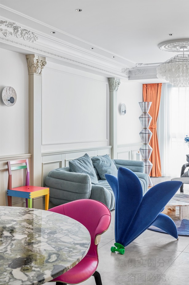 沙發旁邊由彩色木板拼接的椅子來自Giorgetti,給空間增加了活潑的同時,又不會太跳脫。
