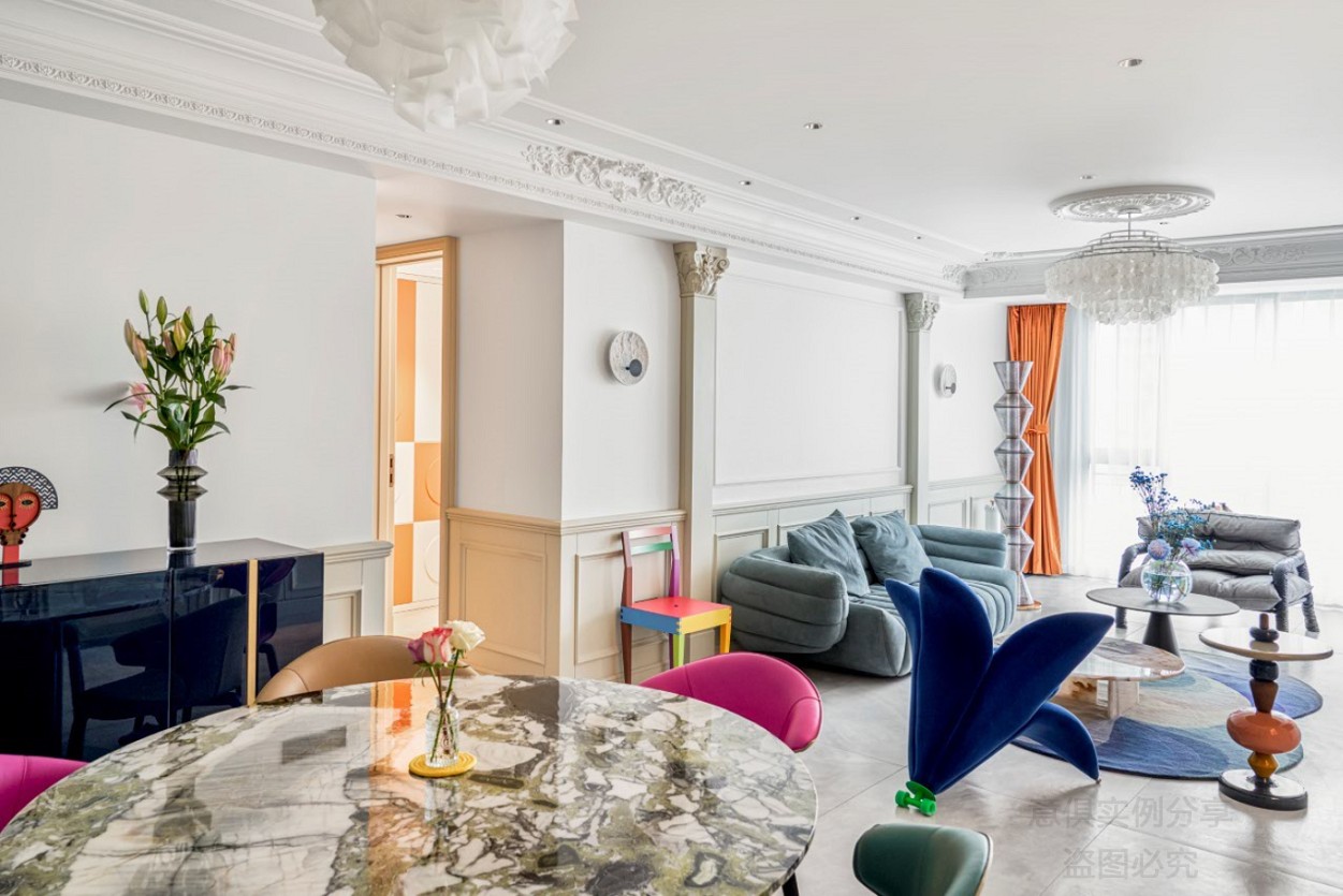 其實在這里有一個小故事,業主當時在選餐椅的時候,我們的搭配顧問給了建議,擔心實物色彩太過跳脫,但是業主堅持了他的選擇,事實證明,她的選擇眼光沒錯,場景圖只有更好看,簡直yyds。