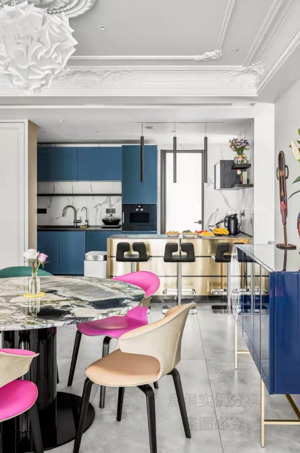 一側Baxter餐邊柜則呼應客廳的色調,優雅的亮面藍色與粉色皮革的餐椅相撞,形成沖突,又巧妙的被大理石給化解。