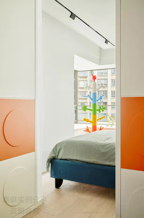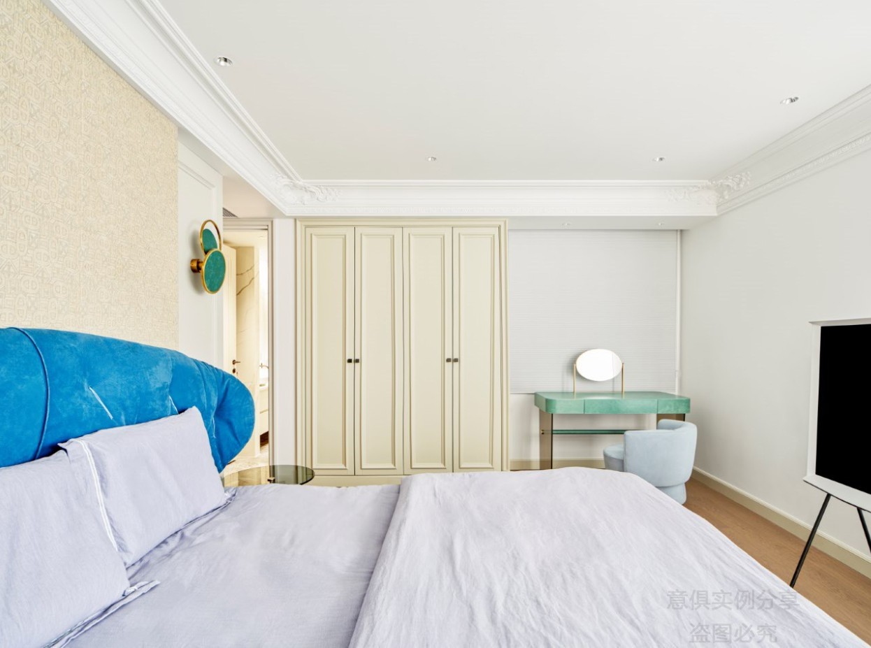 臥室床頭的哥特藍搭配明朗的白色,強烈的沖擊力和空曠明凈的視覺效果,迎面而來的清新,就好像清晨的海邊,寧靜且令人舒適。