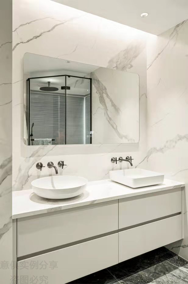 相比公共區域,臥室這樣的私密區域就顯得低調多了,主衛采用低調內斂的白色大理石,干凈又整潔。