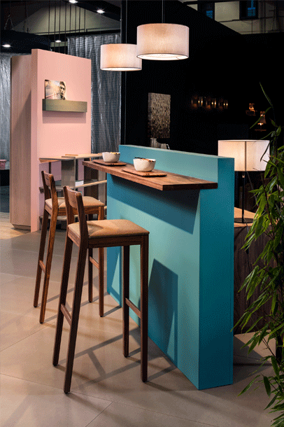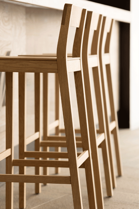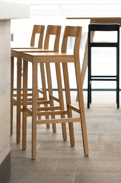 SIT BAR – a simple barstool. With its minimalist design, the SIT range of chairs is suitable for both domestic and commercial settings. With SIT BAR, the chair family is being extended to include a barstool that comes in two different seat heights: 65 and 80 cm. The stool is available in oak, stained oak and American walnut and features either a wooden or upholstered seat. The feet rest comfortably on the slightly sloped footrest. SIT bar: minimalist look, comfortable and sturdy feel.