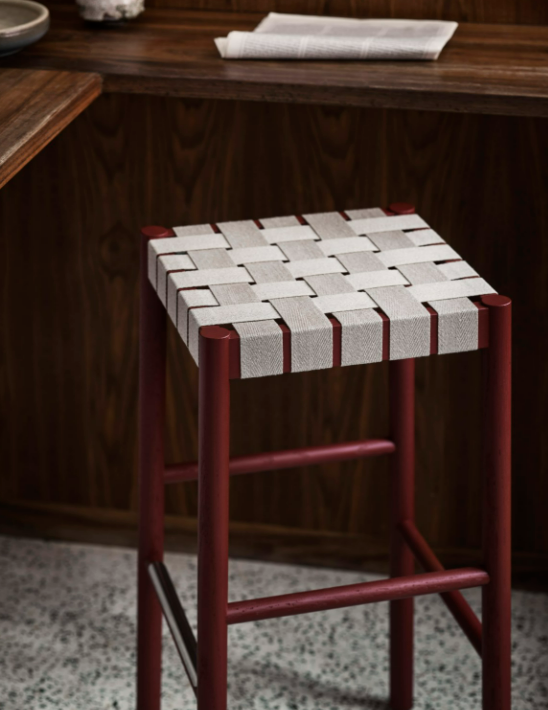 Veneer sheets formpressed together towards a solid wood insert. Milled into shape and lacquered. Natural Rattan weaved around a powder coated stainless steel frame.