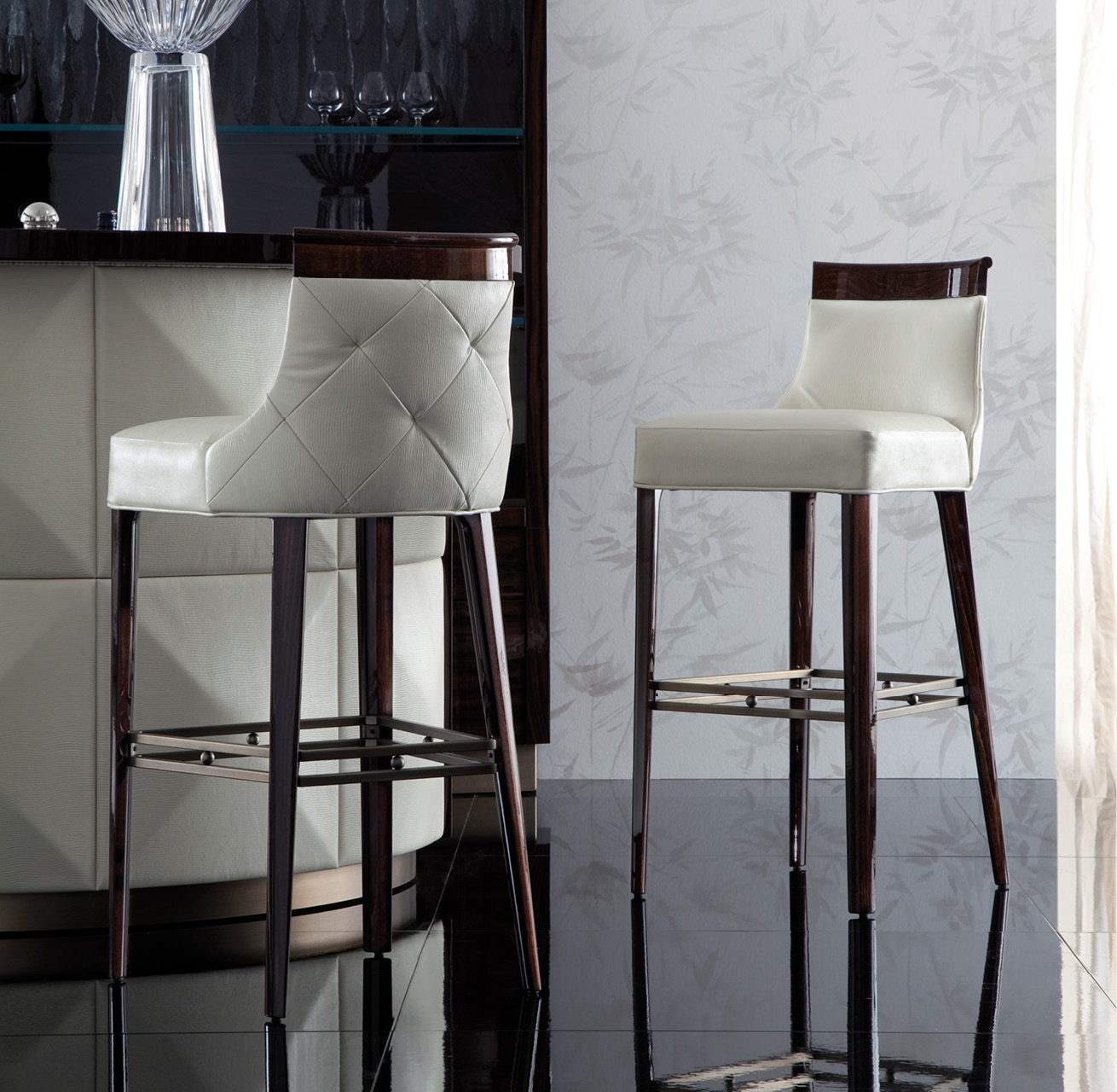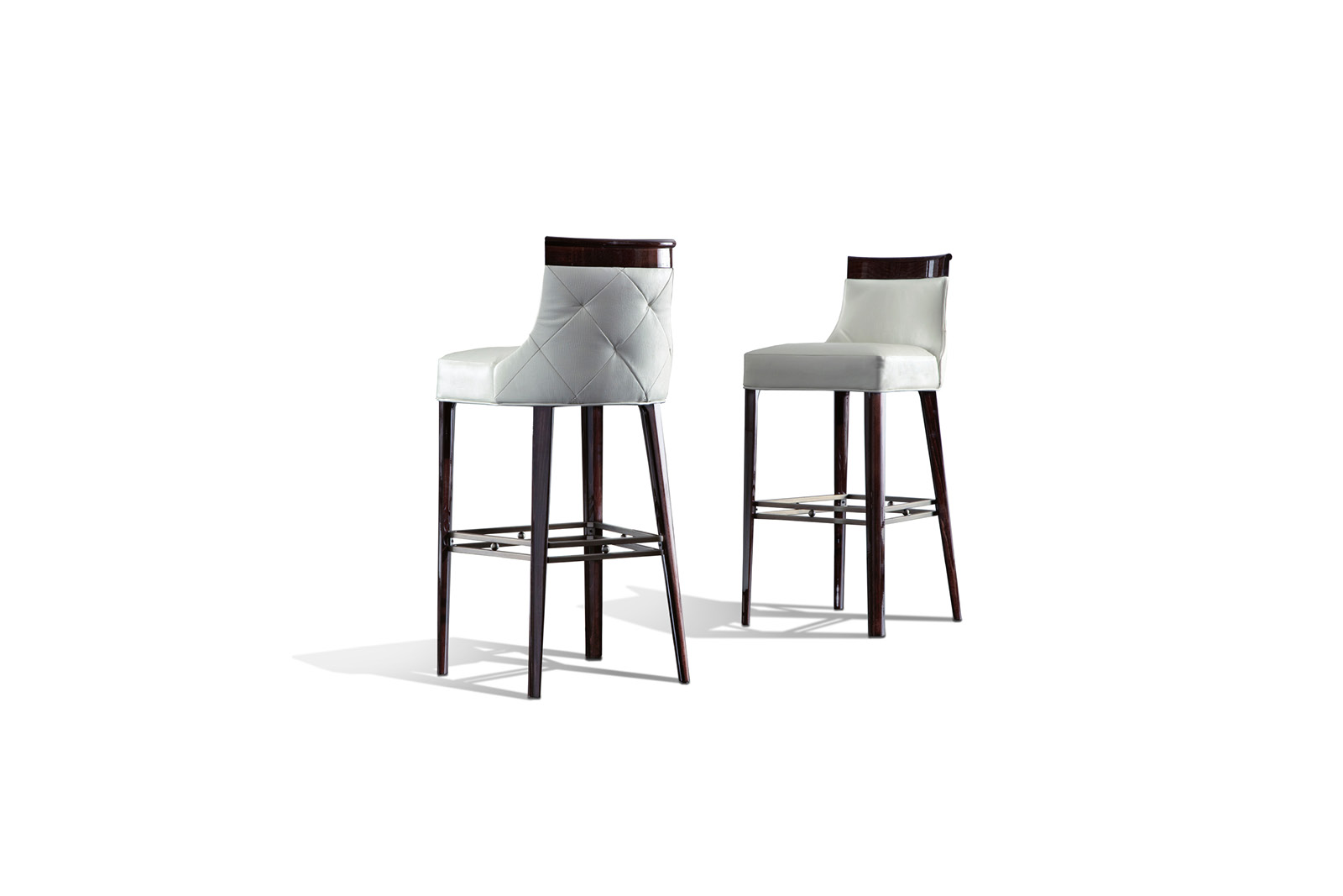 Bar stool in high gloss polyester, in Brazilian rosewood colour with seat and back. Details bronzed stainless steel.