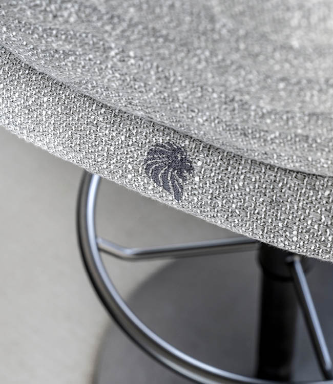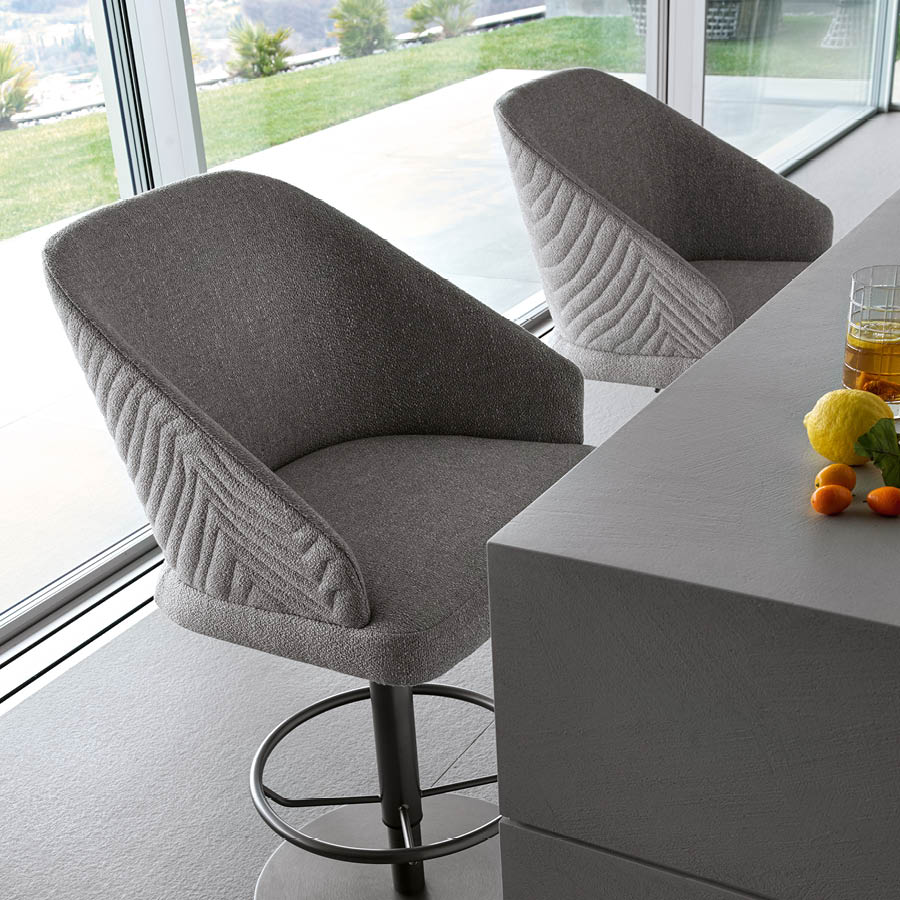 Bar stool in solid beech with swivel and adjustable seat height cm 61/96. Base in satin grey nickel stainless steel with lasered Giorgio Collection logo. Back in quilted first grade leather, nubuk leather, lizard printed leather, velvet or suede fabric with embroidered Giorgio Collection logo on the base.