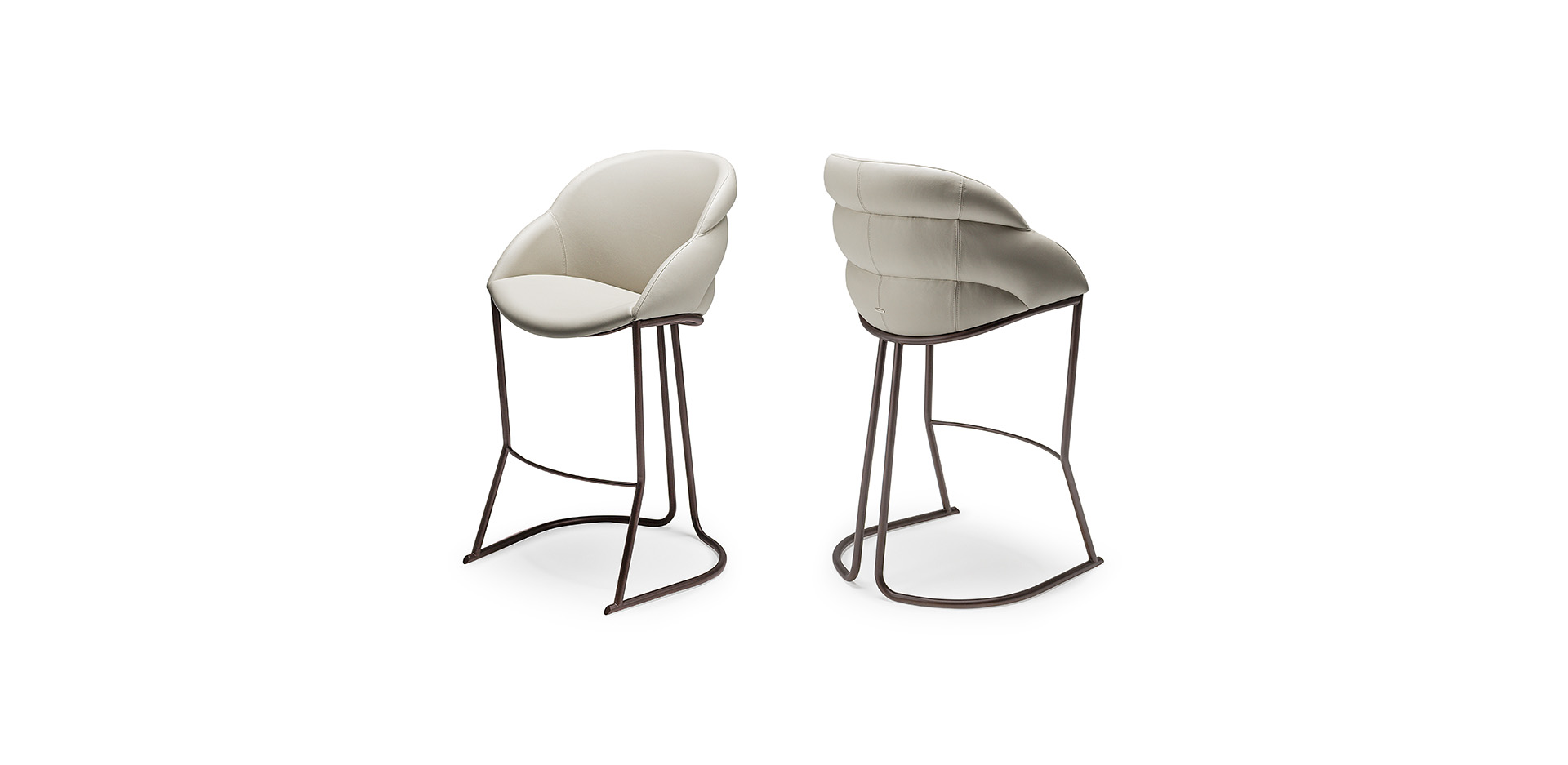The horizontal stitching on the back part of the backrest results in 3 upholstered projections that finish evenly and seamlessly in the armrest. In the lower part of the backrest, the deep frame and leg joints further accentuate the softness of the enveloping curves.